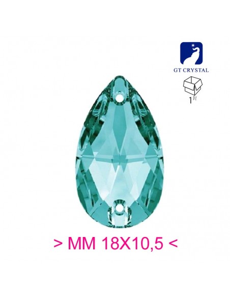 The Stone shaped Drop sewing in Blu Zircon GT Crystal size 18 mm in height and 10.5 mm in width, flat at the bottom and has two holes in the upper side for application with needle and thread.