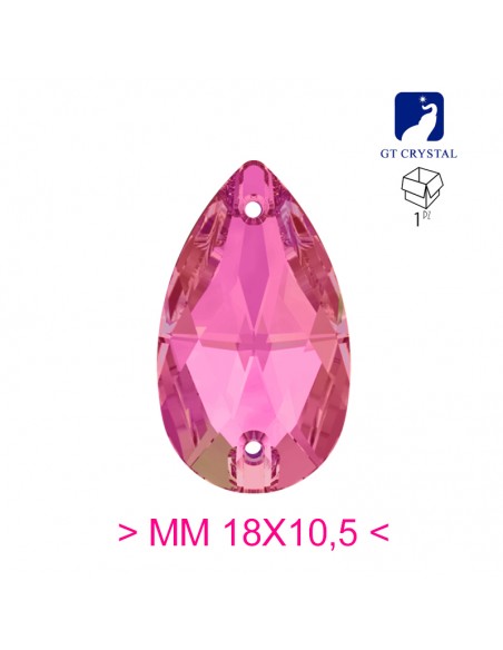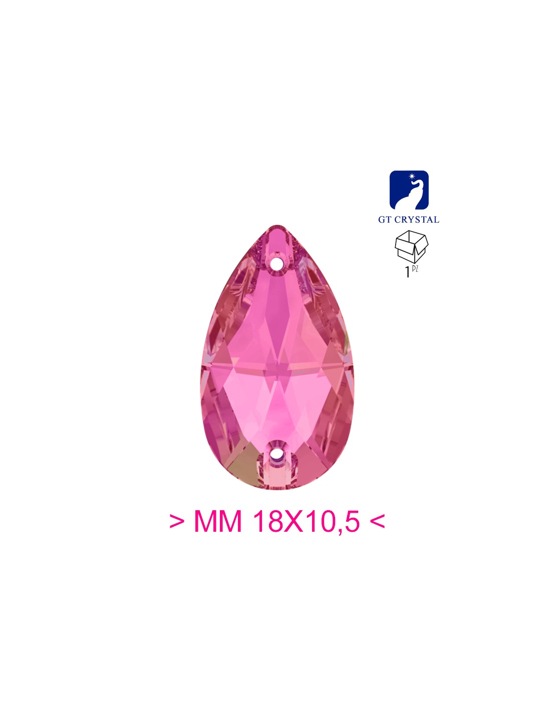 The Stone shaped Drop sewing in Rose GT Crystal size 18 mm in height and 10,5 mm in width, flat at the bottom and has two holes in the upper side for application with needle and thread.
