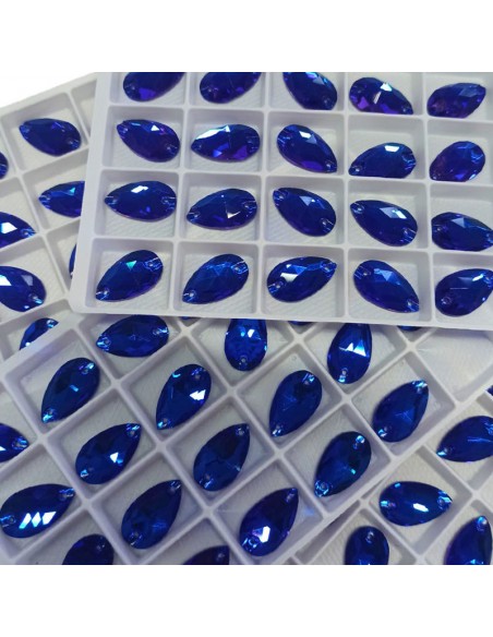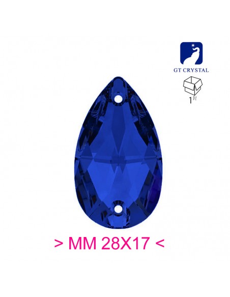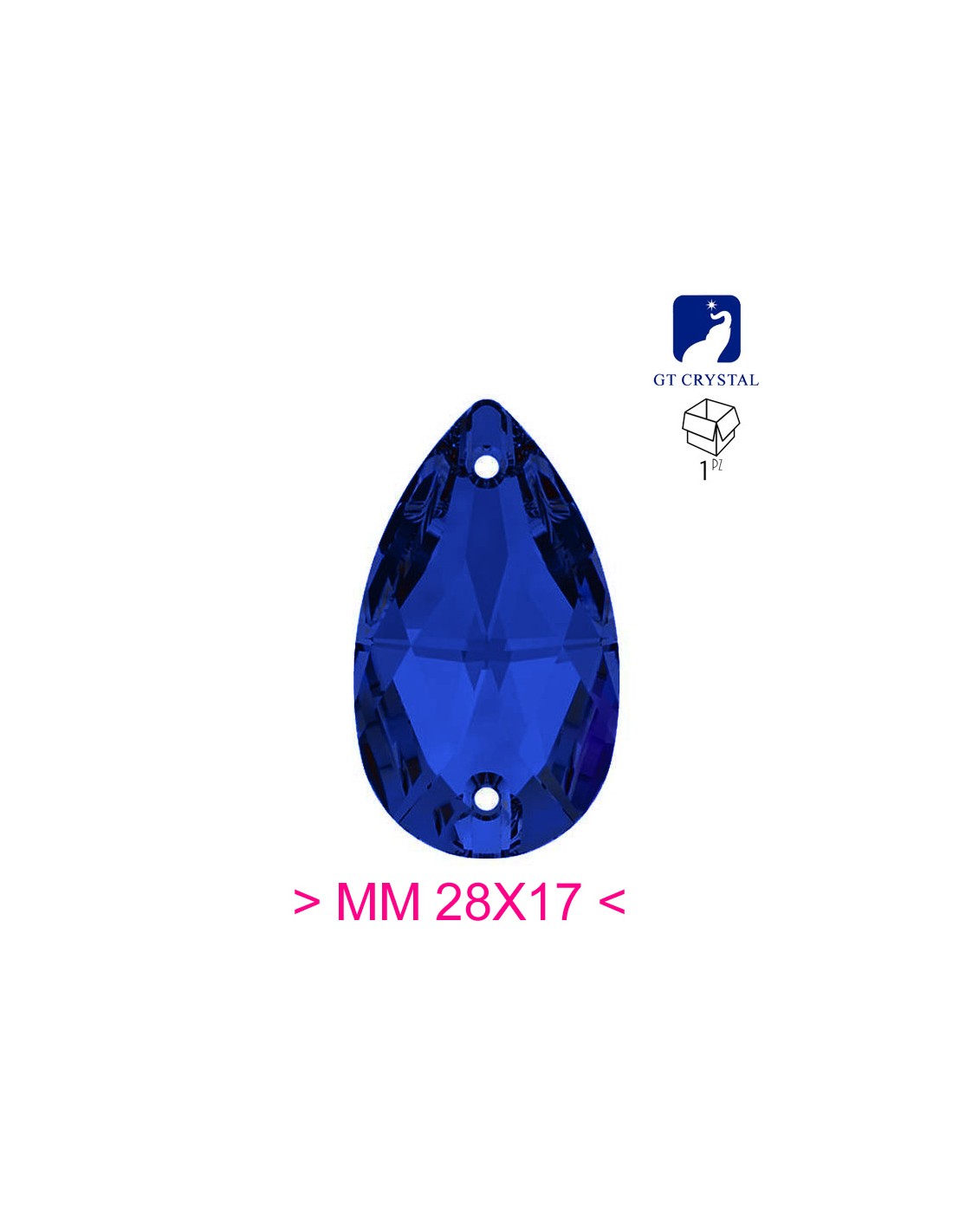 The Stone shaped Drop sewing in Blu Majestic GT Crystal size 28 mm in height and 17 mm in width, flat at the bottom and has two holes in the upper side for application with needle and thread.