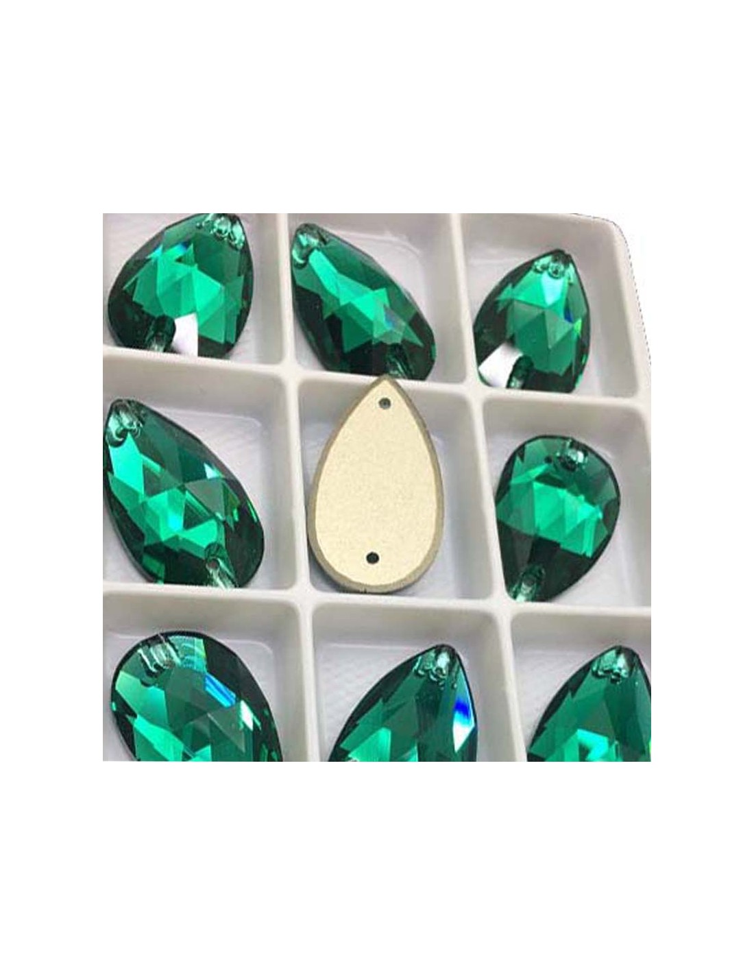 The Stone shaped Drop sewing in Emerald GT Crystal size 28 mm in height and 17 mm in width, flat at the bottom and has two holes in the upper side for application with needle and thread.