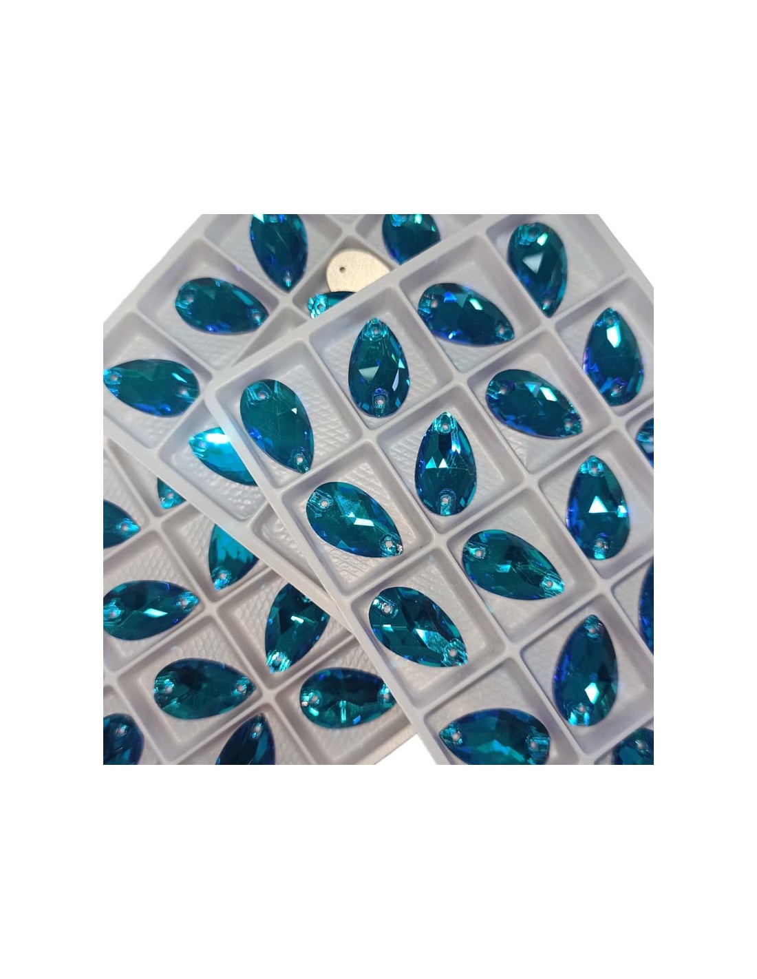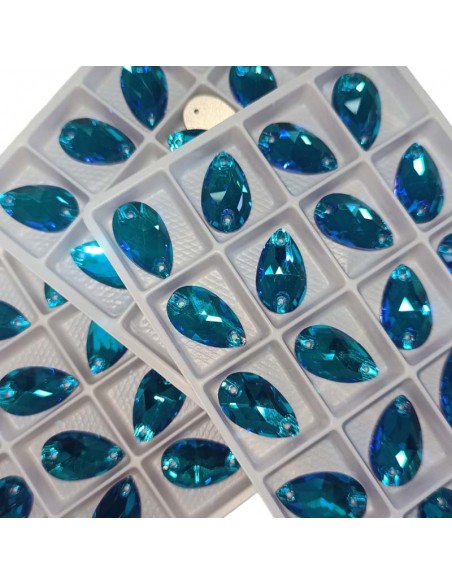 The Stone shaped Drop sewing in Indicolite GT Crystal size 28 mm in height and 17 mm in width, flat at the bottom and has two holes in the upper side for application with needle and thread.
