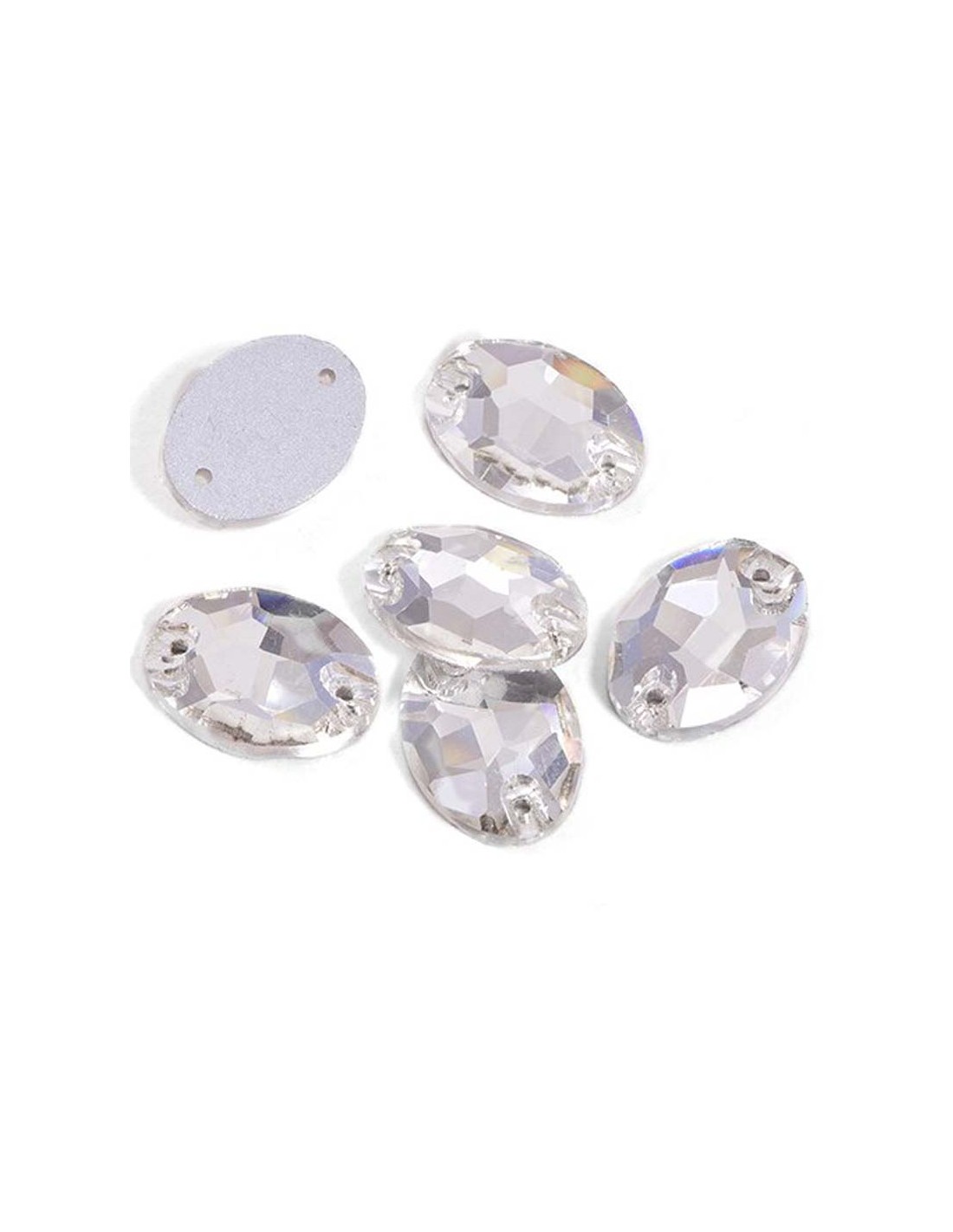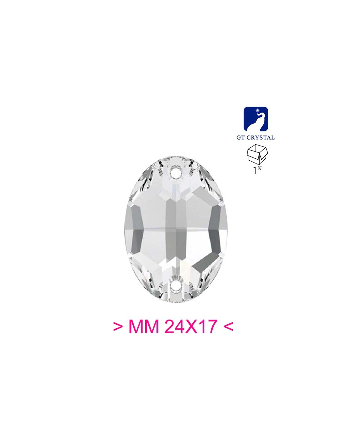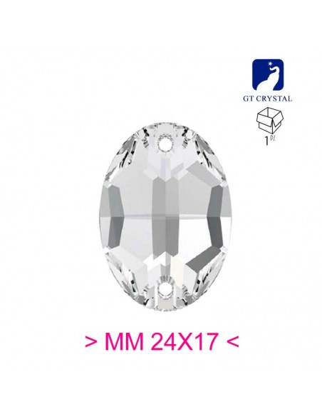 The Stone sewing shaped Oval in Capri Blu GT Crystal size 24 mm in height and 17 mm in width, flat at the bottom and has two holes in the upper side for application with needle and thread.