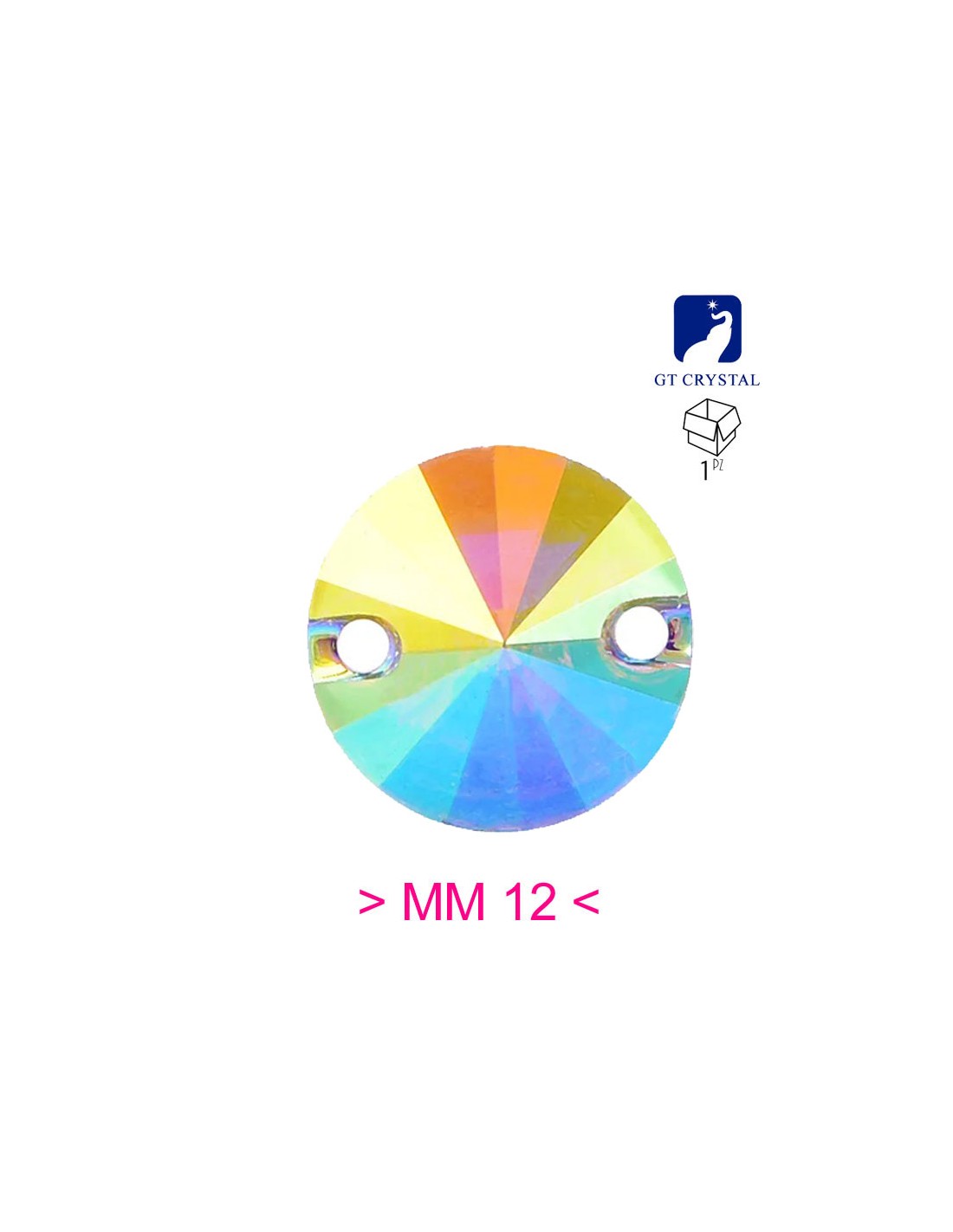 The Stone sewing shaped Round in Aurora Borealis GT Crystal size 12 mm flat at the bottom and with two holes in the upper side for application with needle and thread.