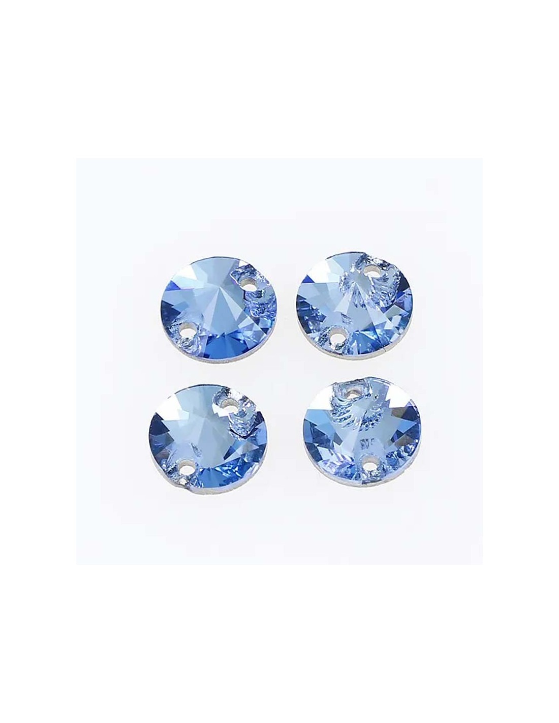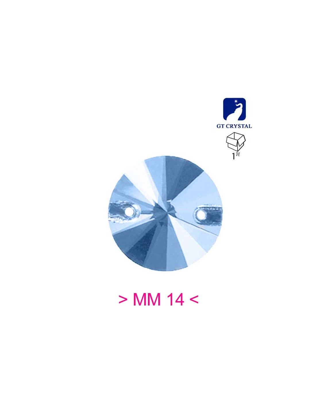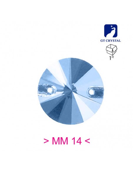 The Stone sewing shaped Round in Aquamarine GT Crystal size 14 mm flat at the bottom and with two holes in the upper side for application with needle and thread.