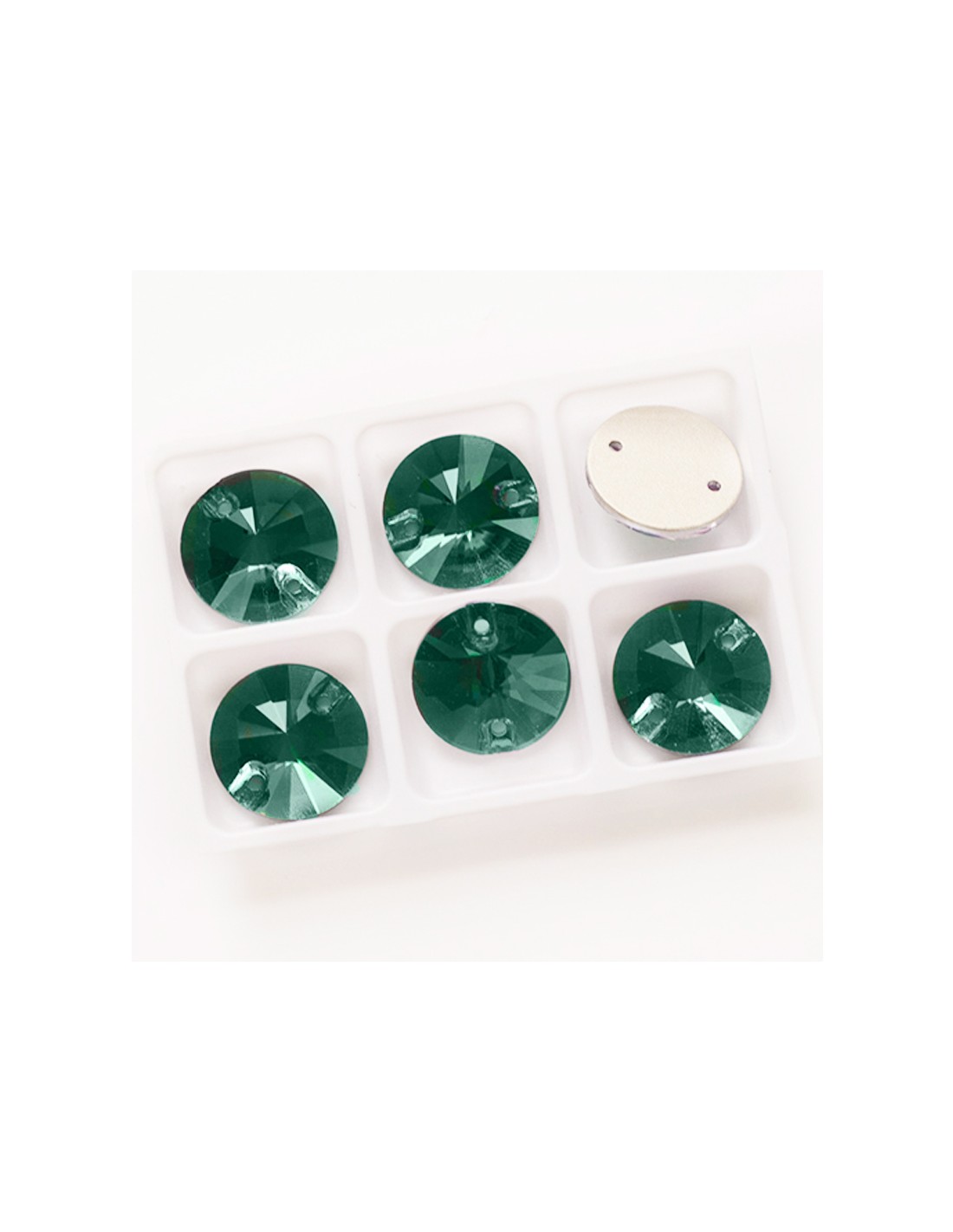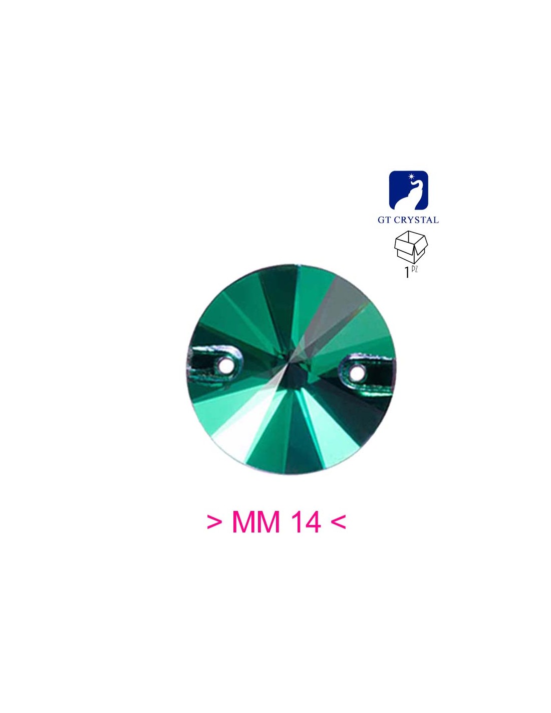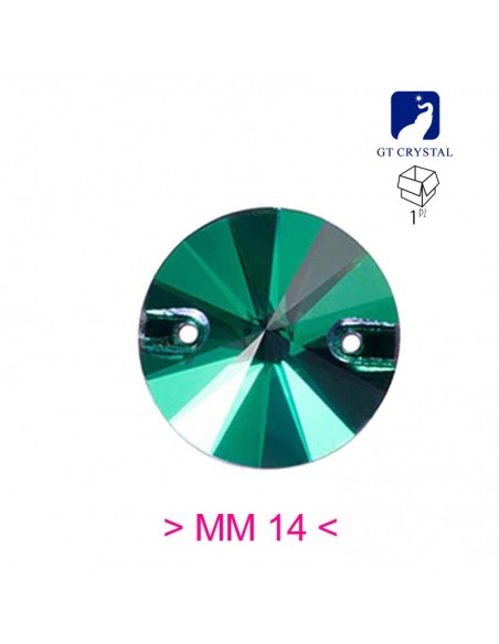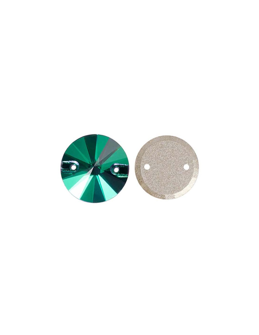 The Stone sewing shaped Round in Emerald GT Crystal size 14 mm flat at the bottom and with two holes in the upper side for application with needle and thread.