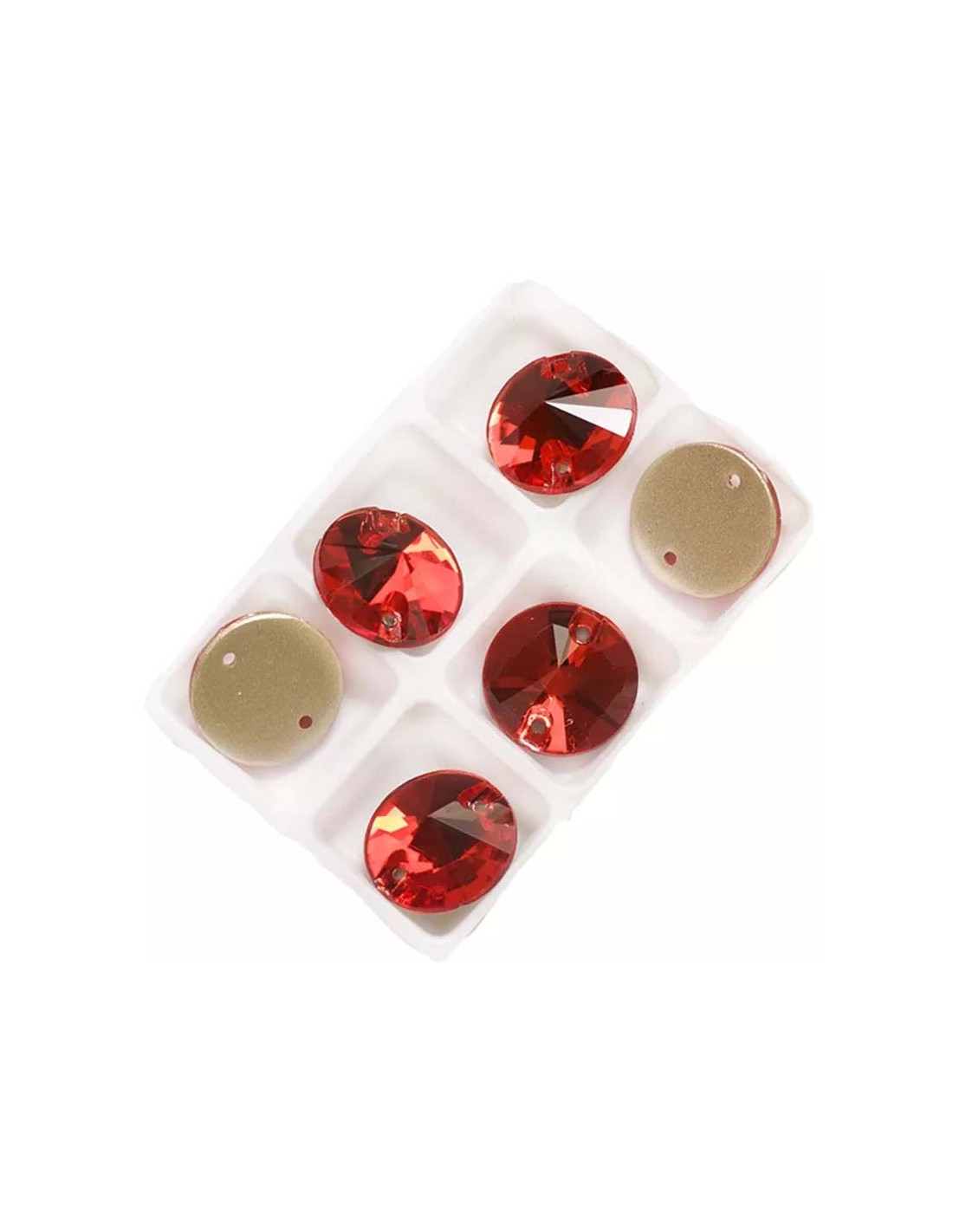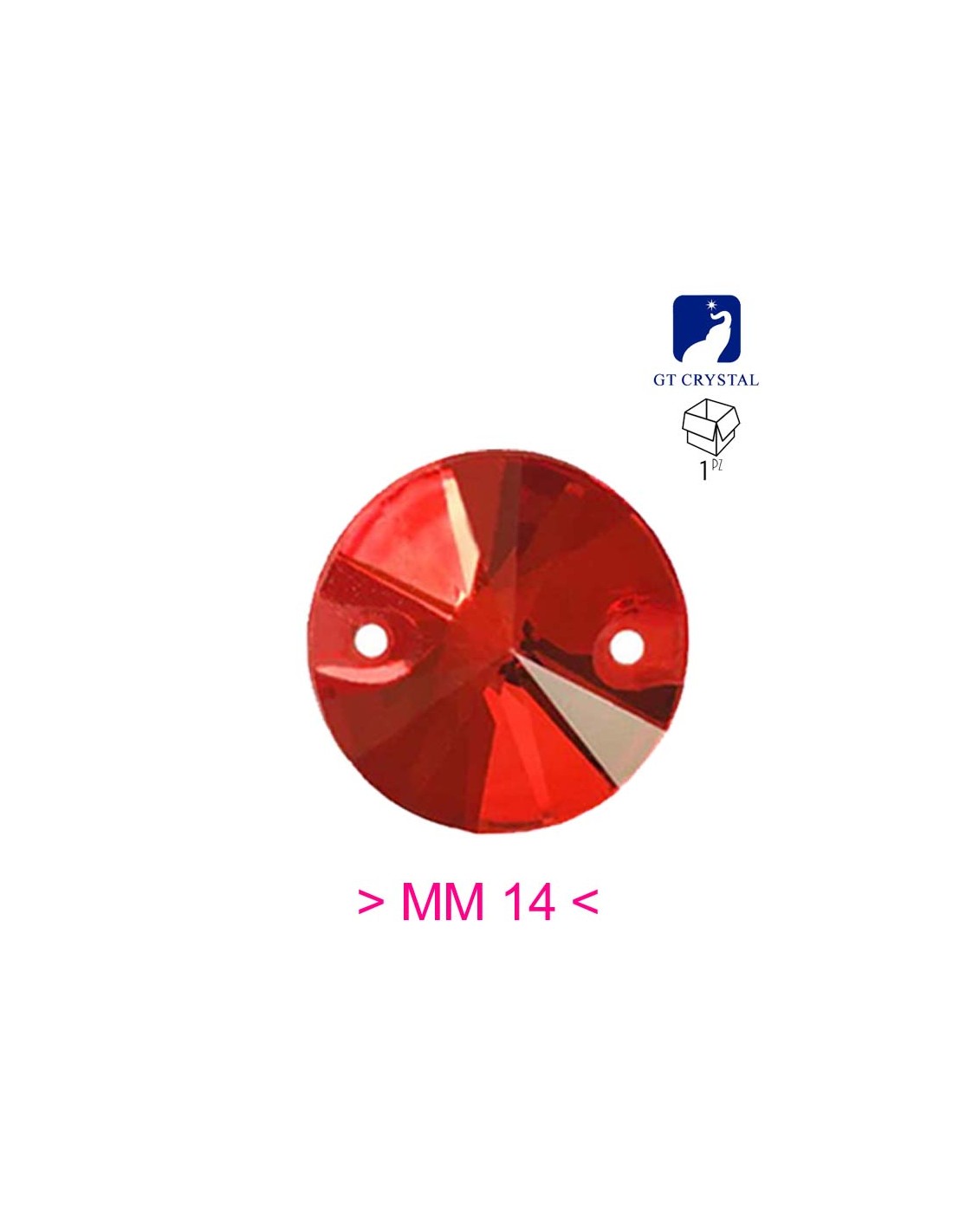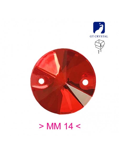 The Stone sewing shaped Round in Light Siam GT Crystal size 14 mm flat at the bottom and with two holes in the upper side for application with needle and thread.