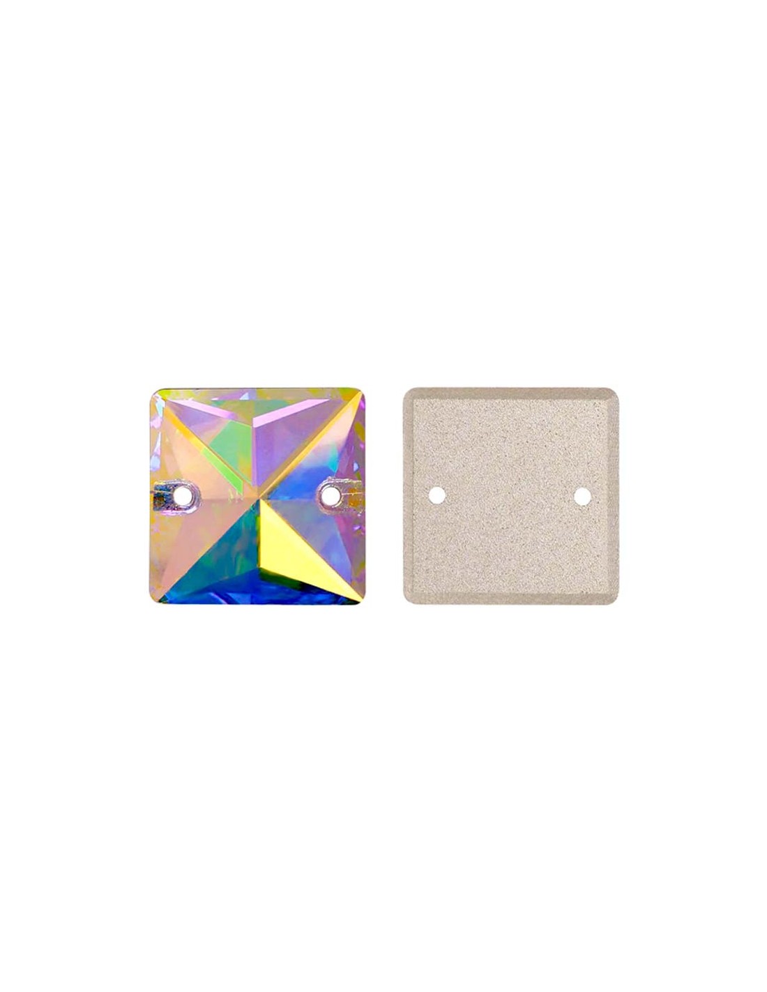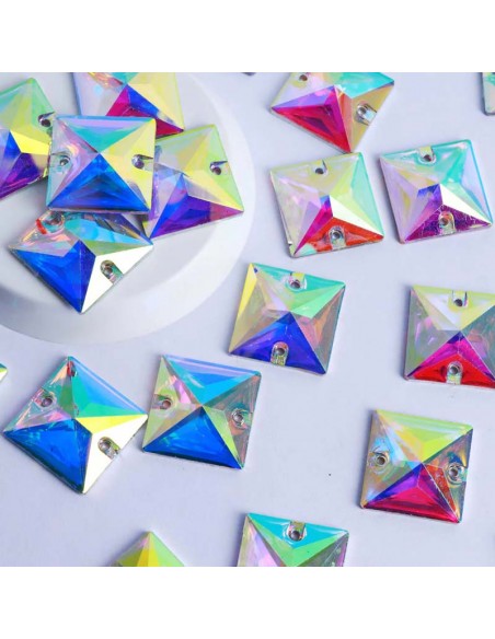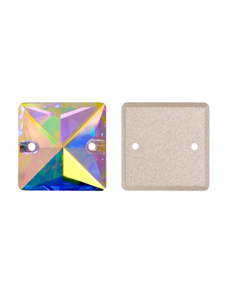 The Stone sewing shaped Square in Crystal Aurora Borealis GT Crystal size 16 mm flat at the bottom and has three holes at the corners for application with needle and thread.