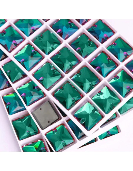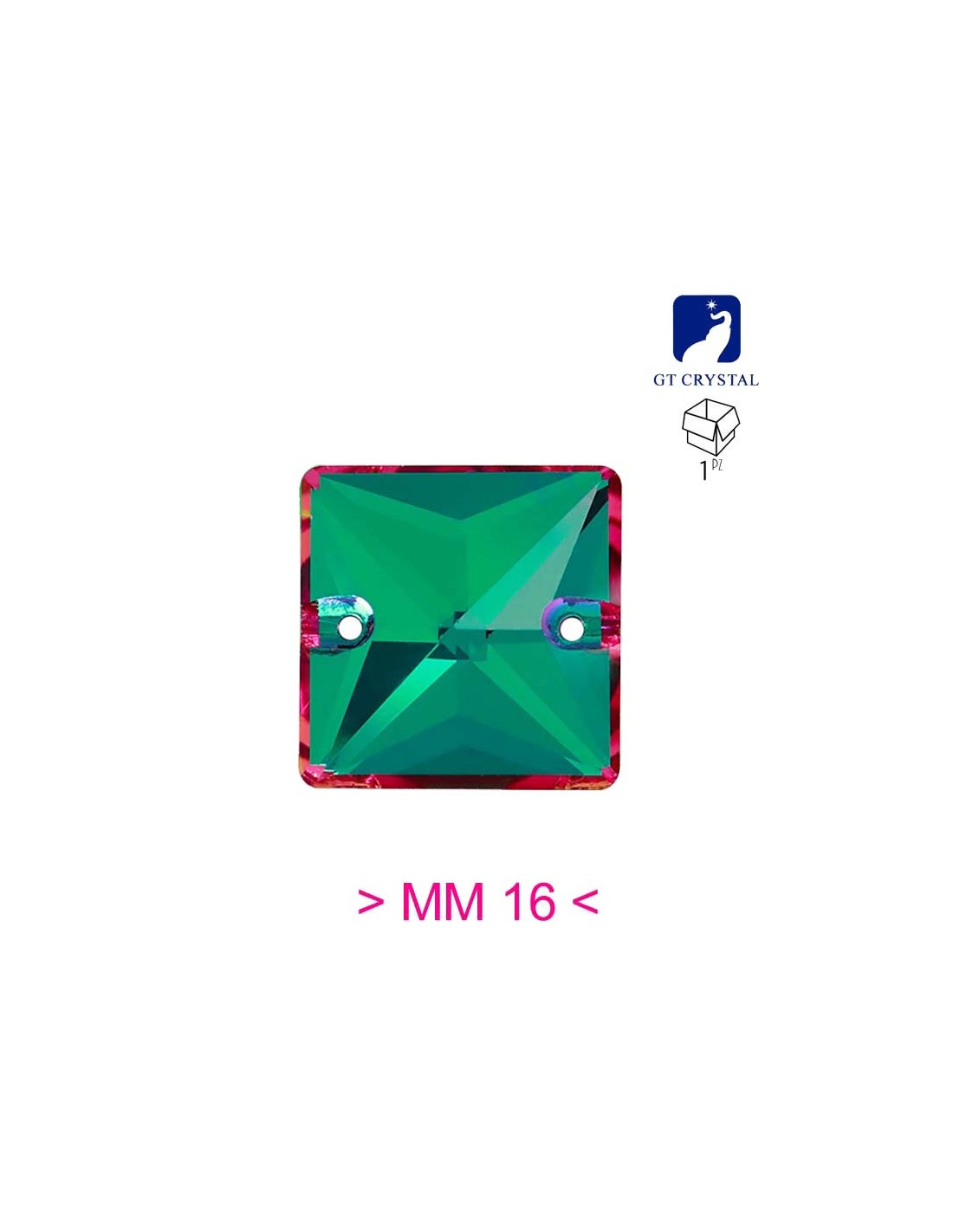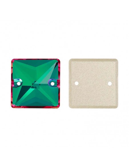 The Stone sewing shaped Square in Emerald GT Crystal size 16 mm flat at the bottom and has three holes at the corners for application with needle and thread.