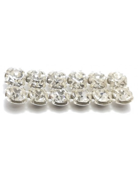 Gli Strass Mc Chaton in cristallo colore Crystal ss 19 (mm 4.60) sono incastonati in coppette di metallo in colore argento e montati a 2 fili su rete di cotone bianca.