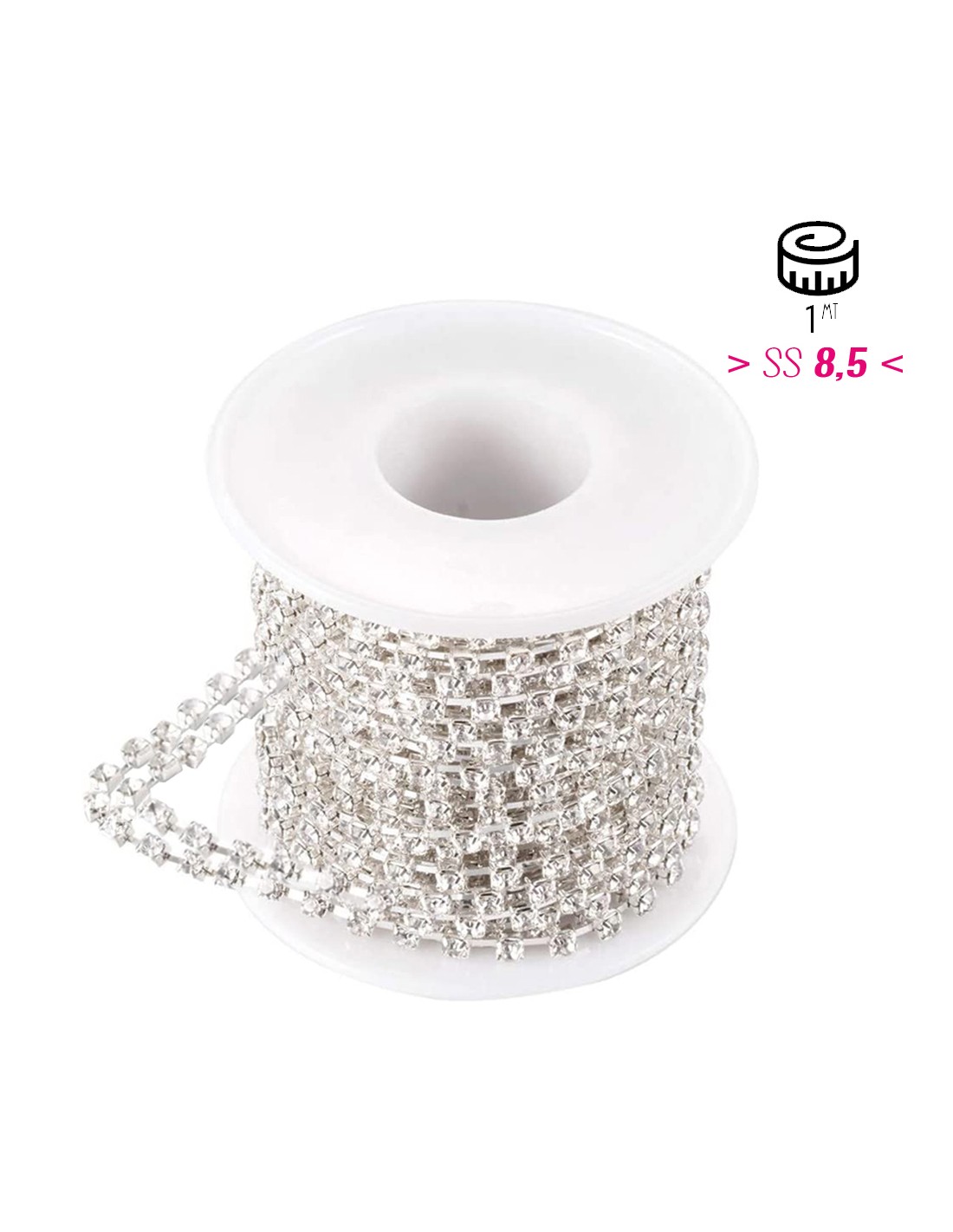 Catena Strass metallica da cucire o incollare con strass in cristallo, lo strass e’ ss 8,5 (mm 2,50) montato su castone metallico Distanziato colore Silver (Argento). La catena strass ss 8,5 (mm 2,50) a 2 fili, proprio per le sue dimensioni e’ adatta per eseguire dei lavori su manufatti o complementi d’arredo.