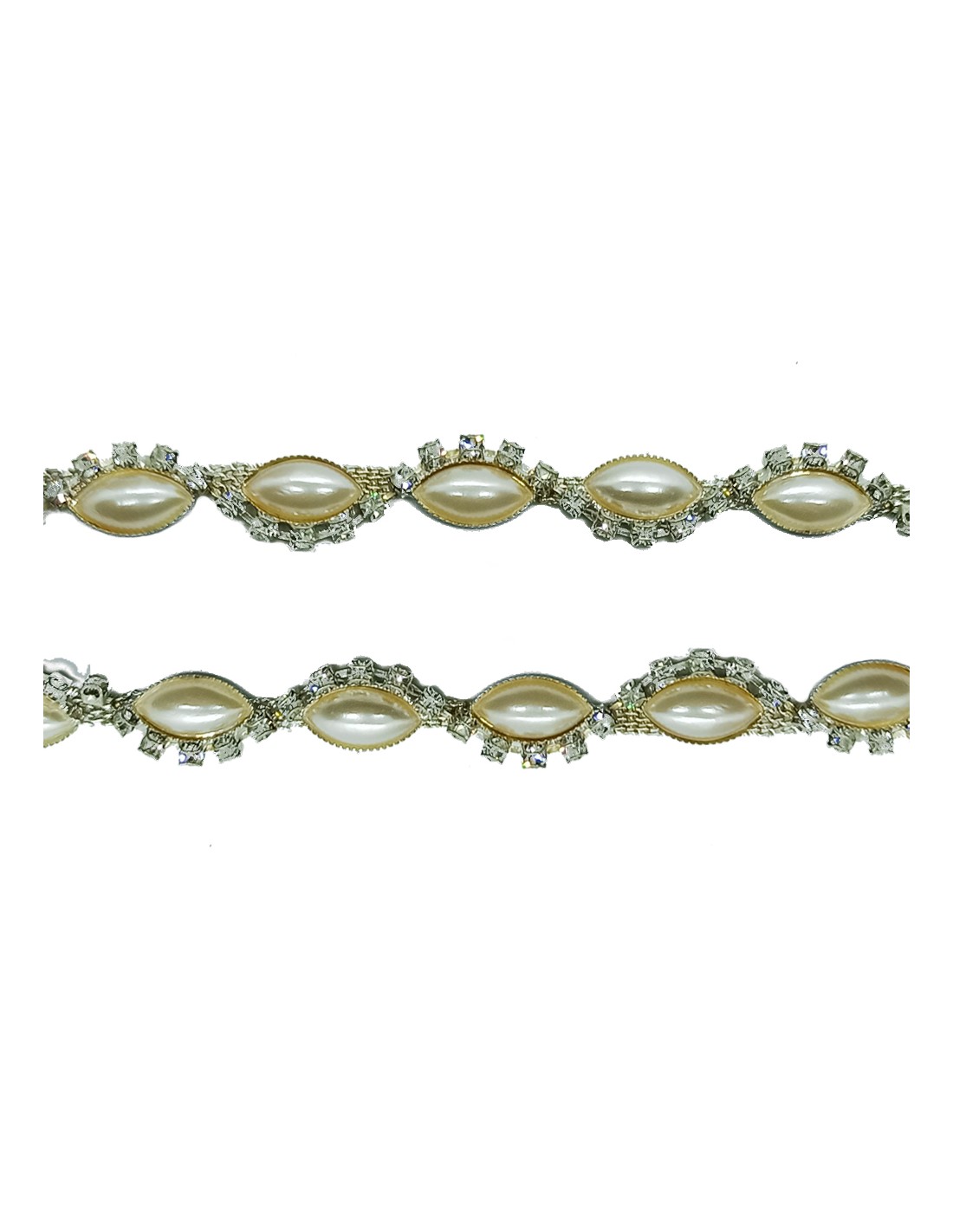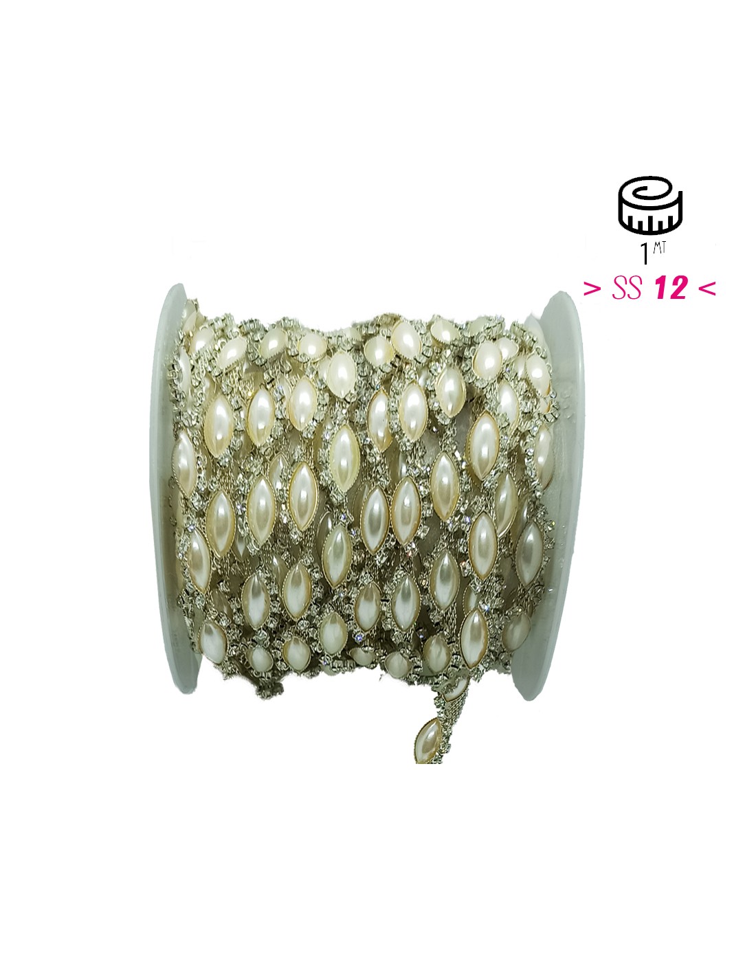 La Catena Strass Gioiello si puo' cucire o incollare. composta da una maglia metallica di colore Argento su cui vi e' saldata la Catena Strass con castone a lunetta Crystal-Silver ss 12 (mm 3,20) e delle Perle in resina di forma geometrica navetta in maniera alternata, tanto da formare un'onda.