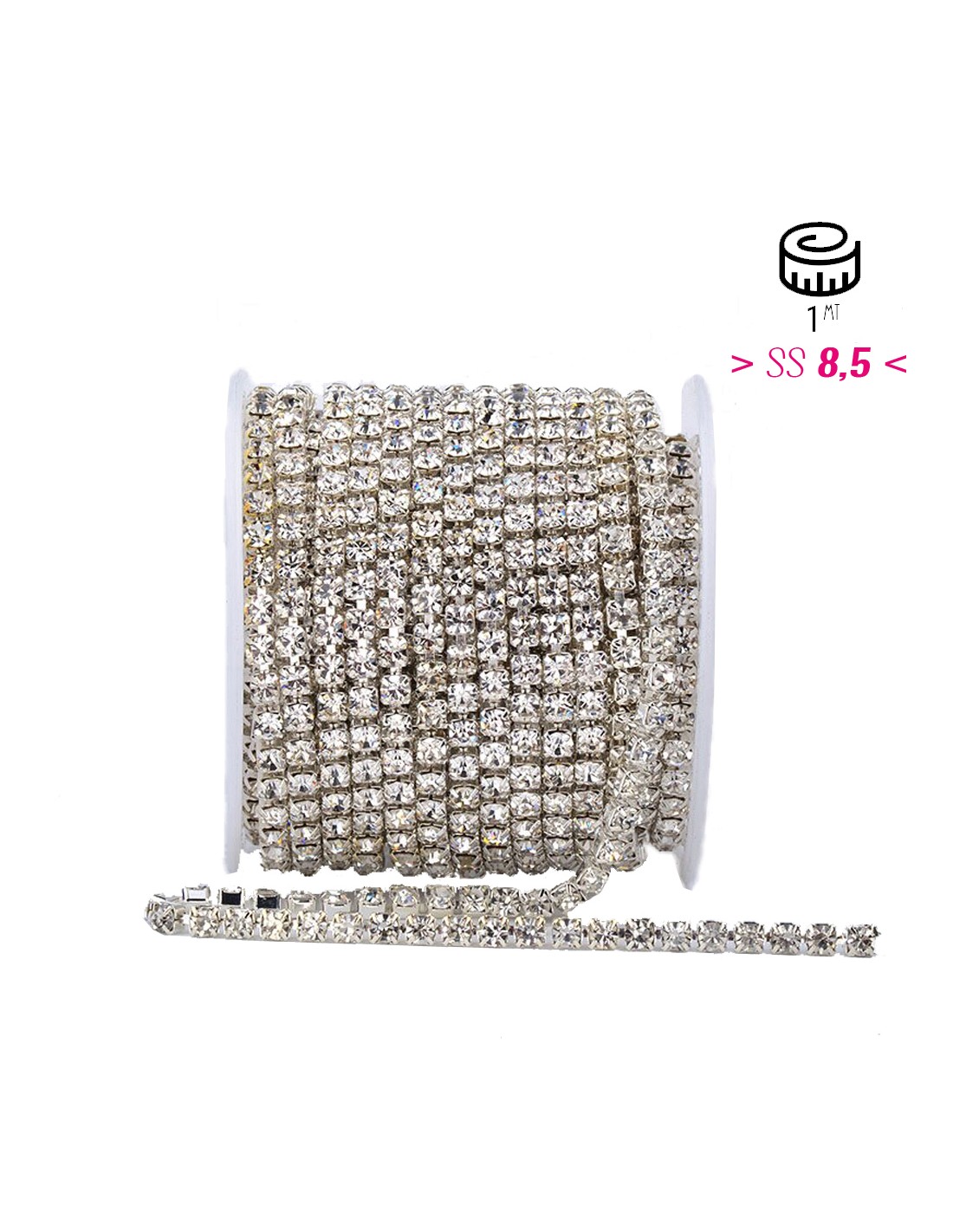 La catena strass ss 8,5 (mm 2,5) a d 1 filo , viene fornita in lotto da 20 cm., proprio per le sue dimensioni adatta per eseguire dei lavori su manufatti o capi d'abbigliamento molto ricercati e di qualita'.