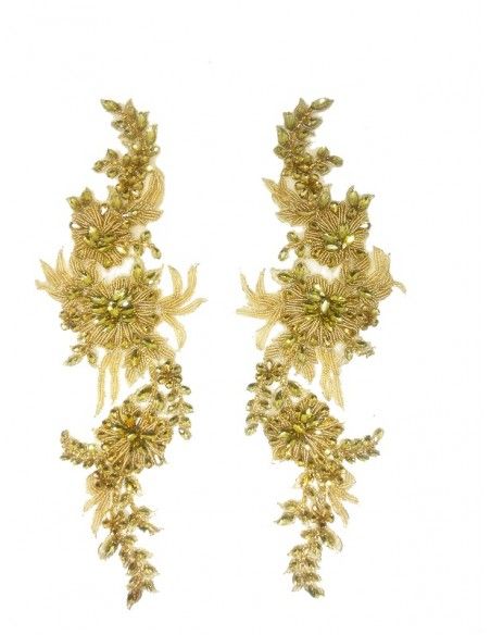 L’applicazione Strass misura cm 40 in lunghezza e cm 12 in larghezza, viene creata con pietre montate su castoni di colore oro che danno risalto al topaz delle pietre da cucire a forme di navetta, goccia, tondo in cristallo colore topaz, e corallini in colore oro. Infine la composizione viene cucita su un velo in tulle oro per poter essere cucita su i vostri abiti a piacimento come meglio desiderate.
