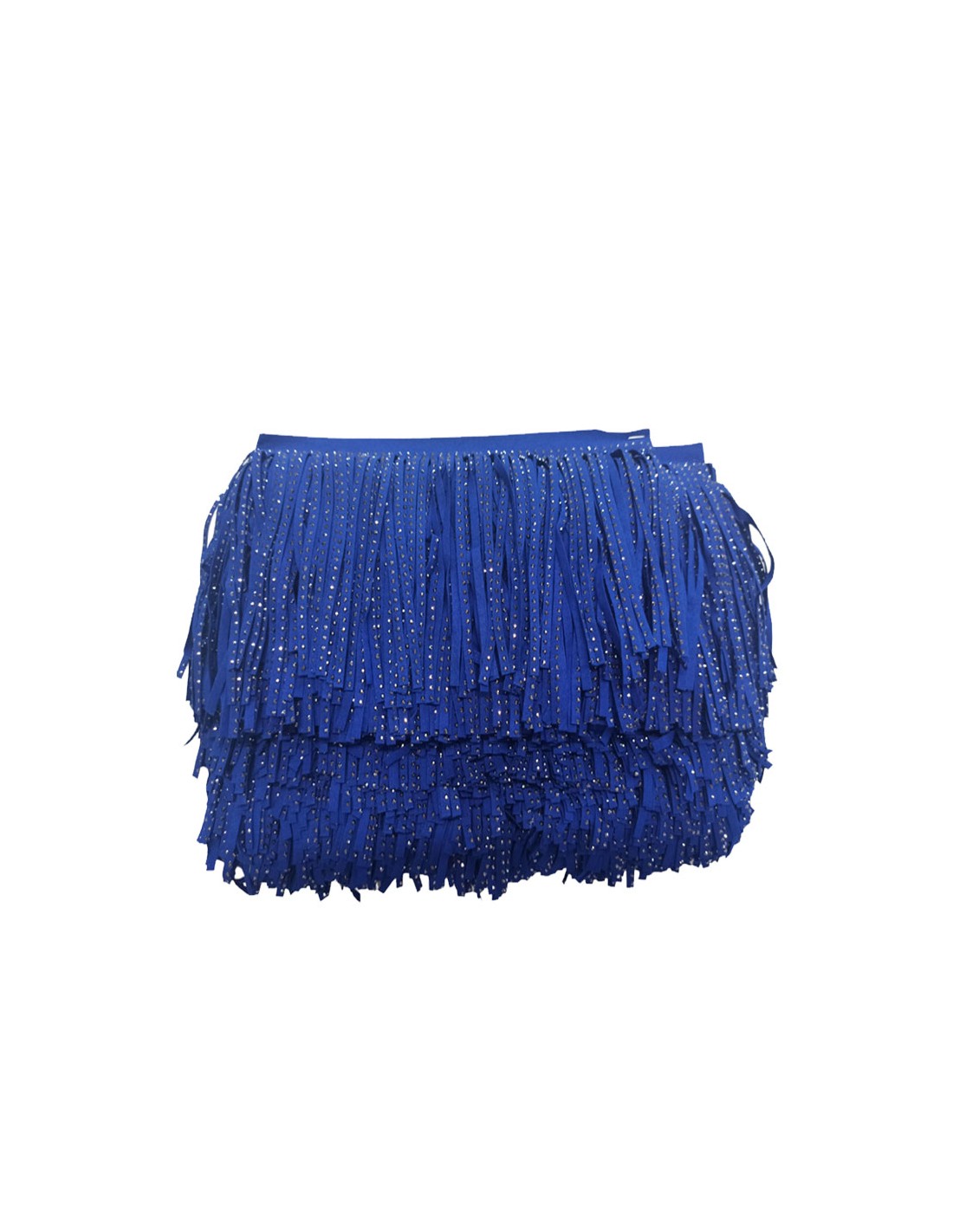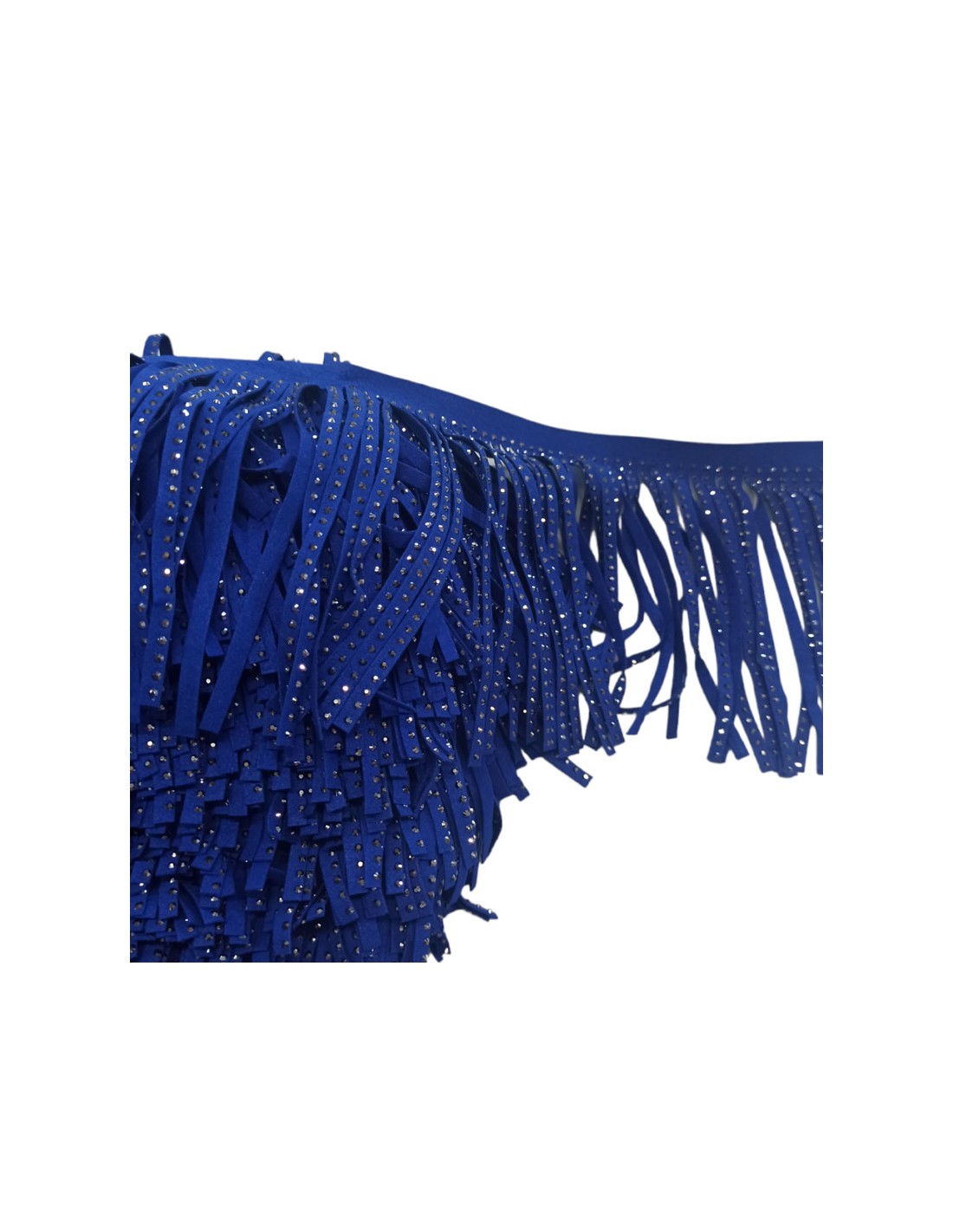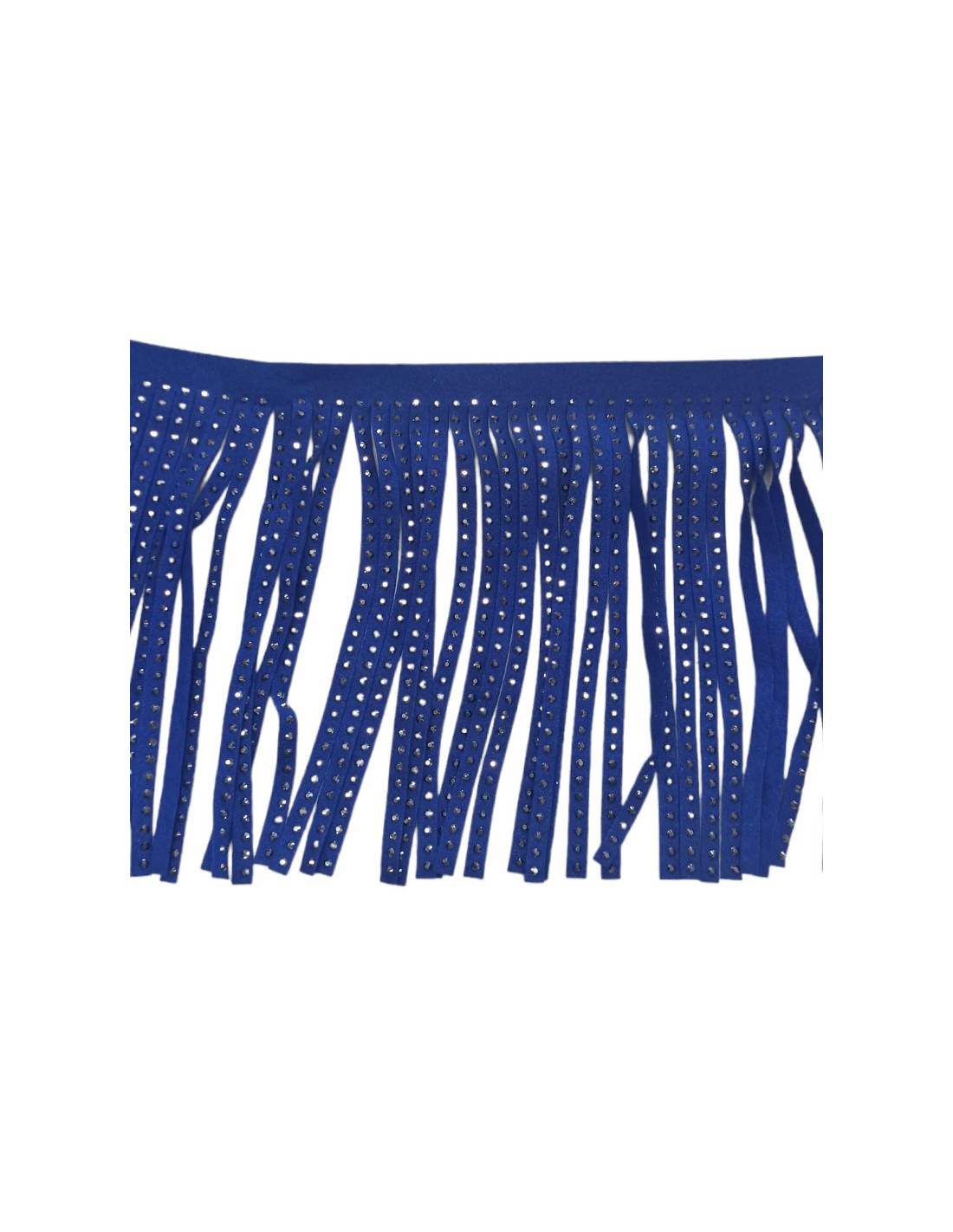 La Frangia in Camoscio Blu Royal con Strass di colore Hematite e' fatta di strisce di camoscio larghe mm 4 e alte cm 14.