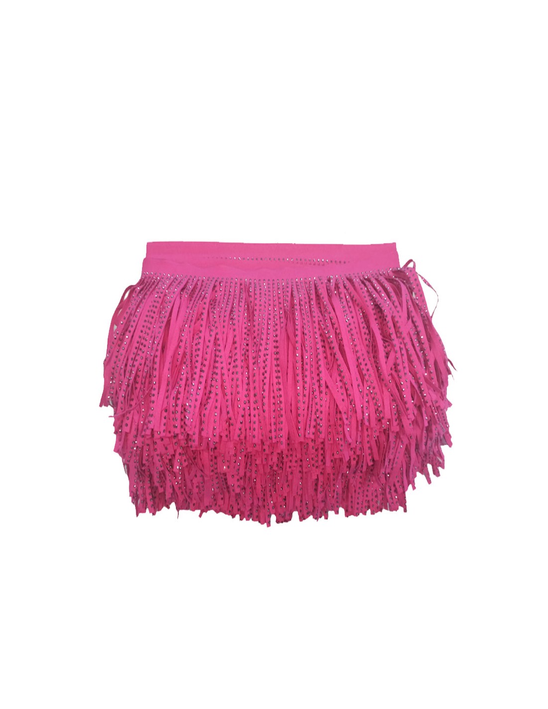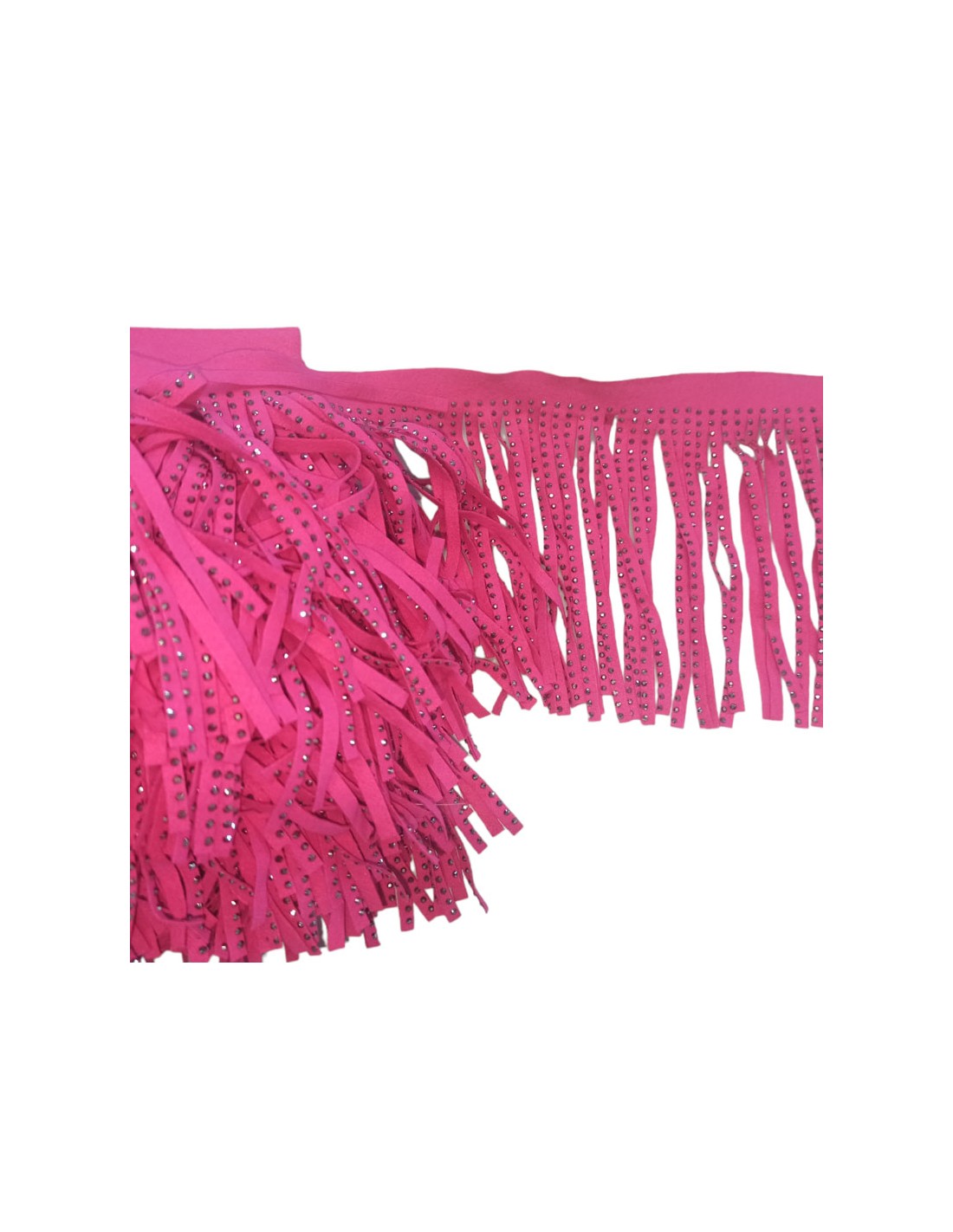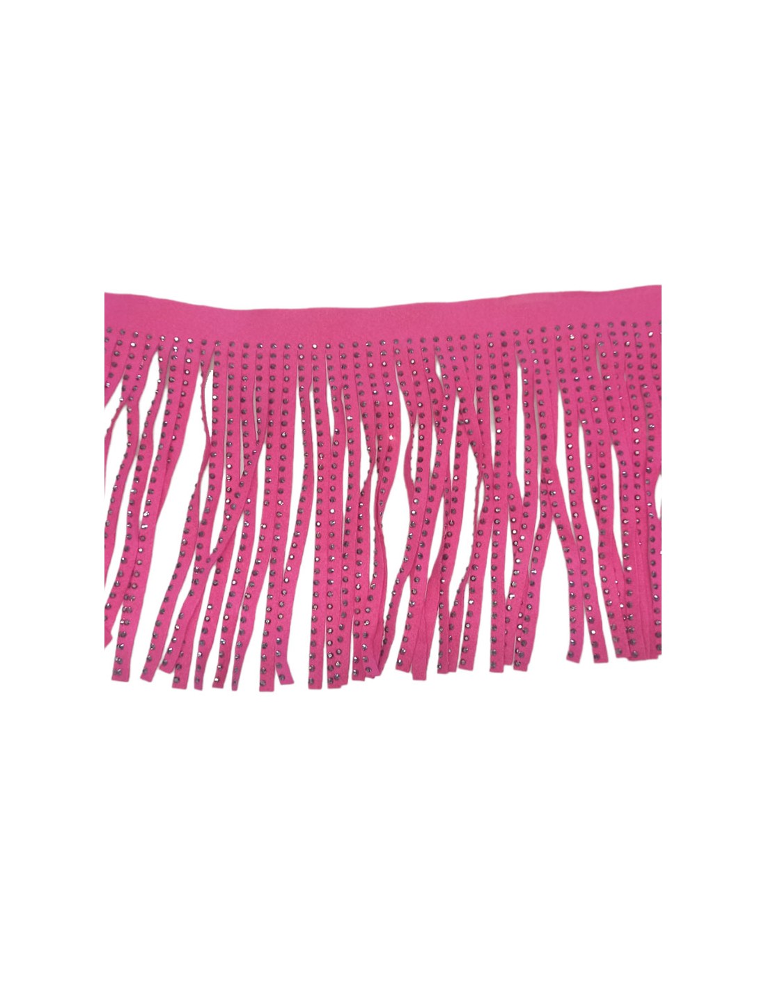 La Frangia in Camoscio Fuchsia con Strass di colore Hematite e' fatta di strisce di camoscio larghe mm 4 e alte cm 14.