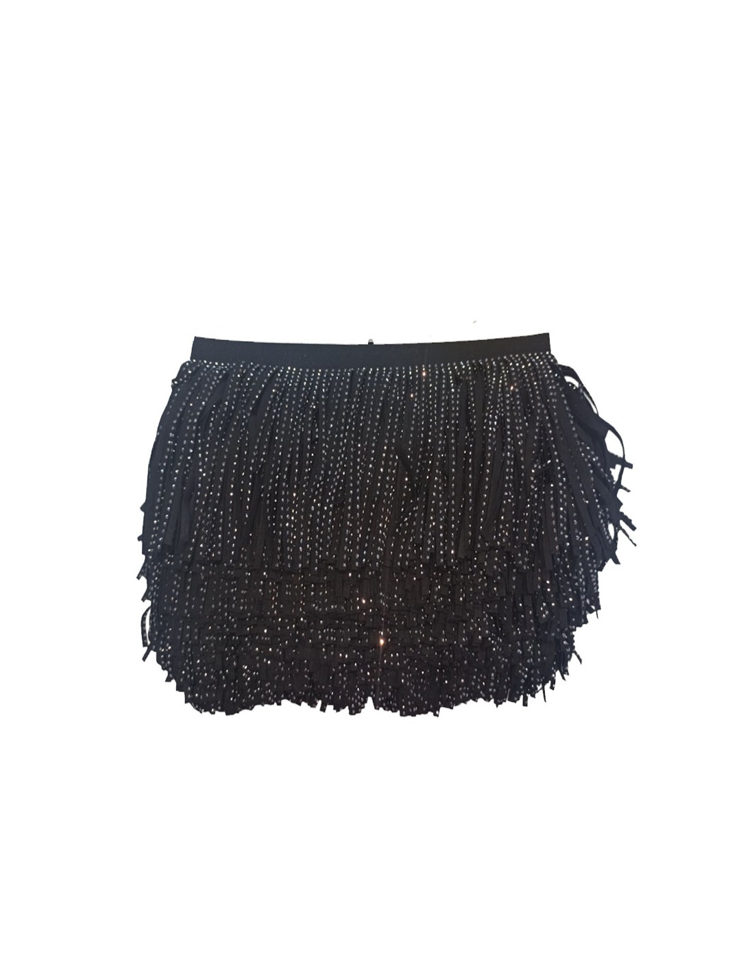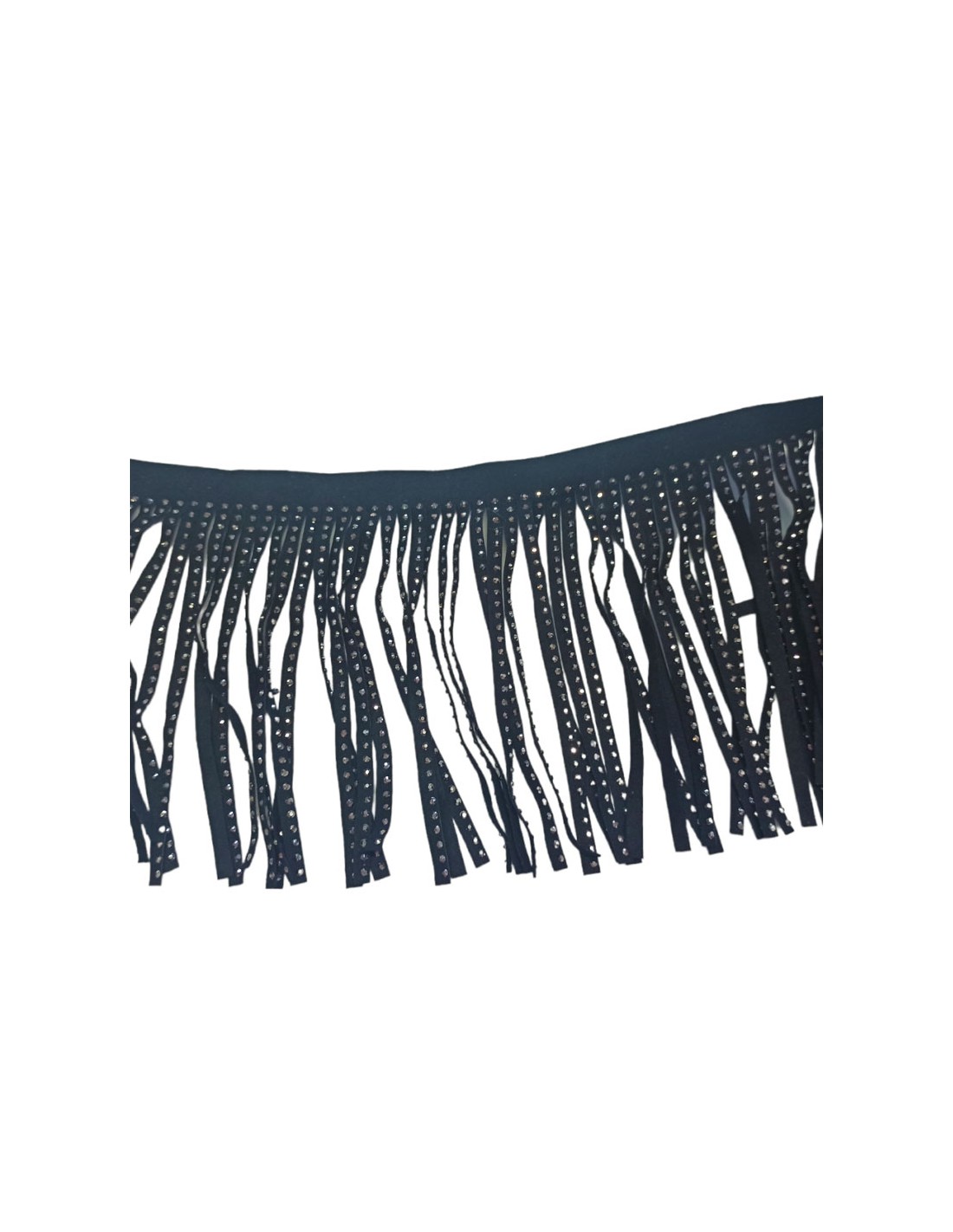 La Frangia in Camoscio Nero con Strass di colore Hematite e' fatta di strisce di camoscio larghe mm 4 e alte cm 14.