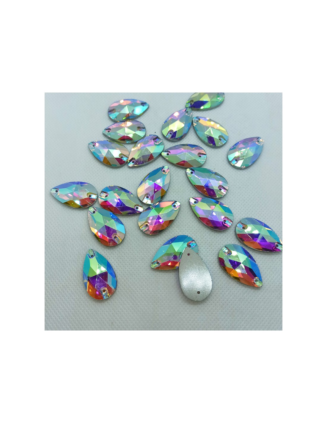 La pietra da Cucire in Cristallo Stars Goccia Crystal Aurora Boreale misura mm 28 in altezza e mm 17 in larghezza, piatta nella parte inferiore ed dotata di due fori nella parte laterale superiore per l'applicazione con ago e filo.