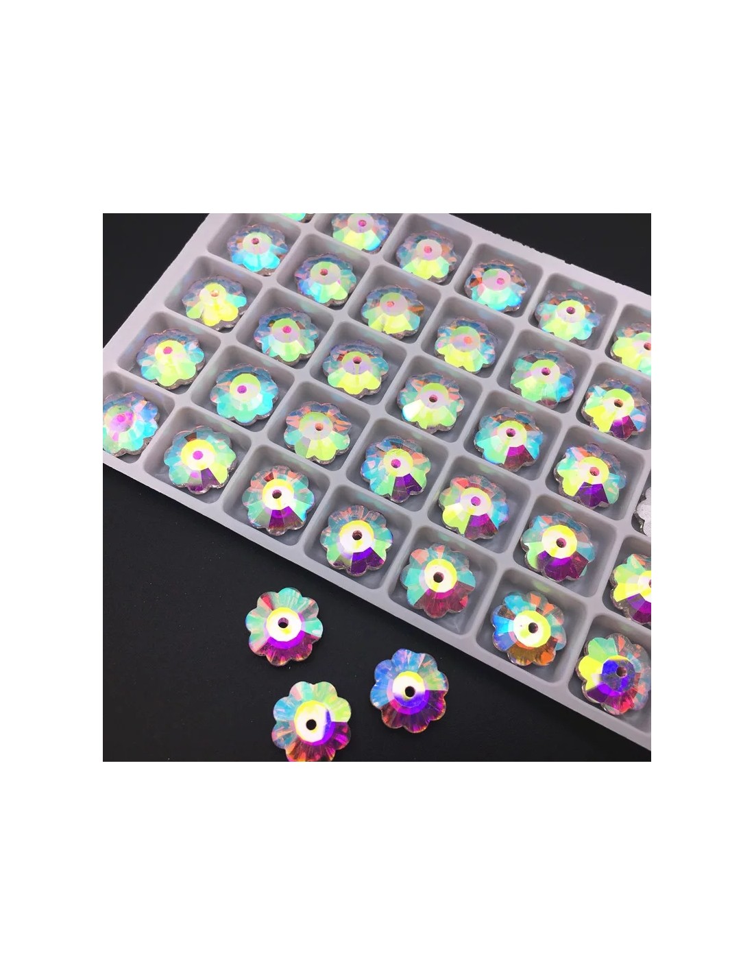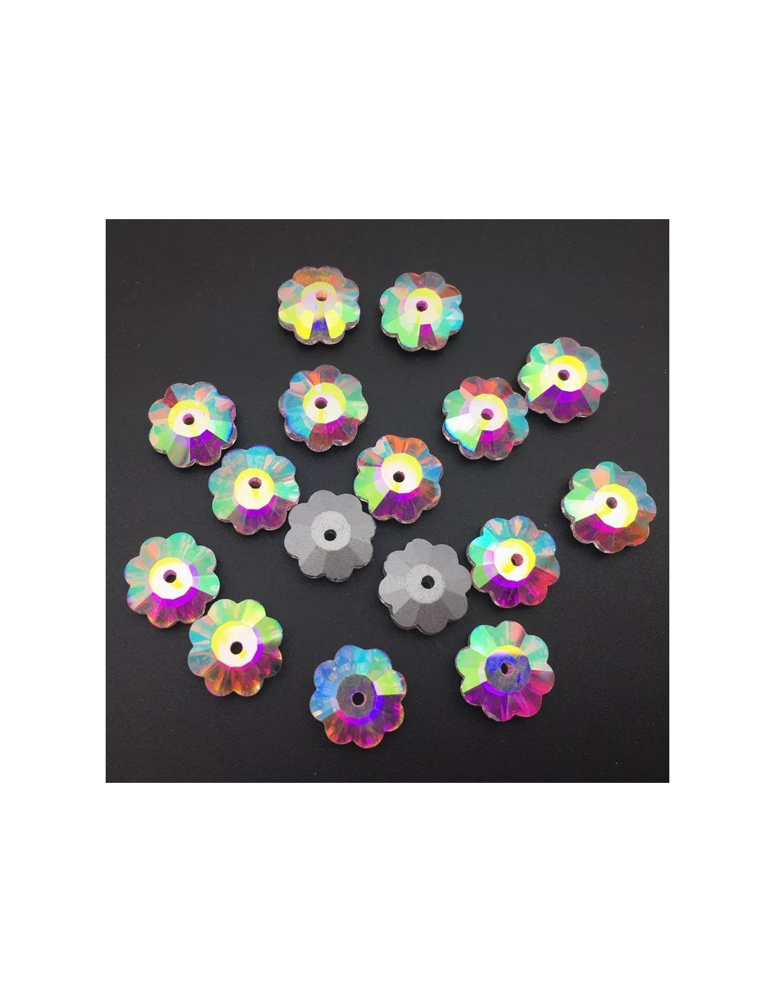 La pietra da Cucire in Cristallo GT Crystal Fiore Crystal Aurora Boreale misura mm 10 e’ bombato nella parte inferiore ed e’ dotata di un foro nella parte centrale per l’applicazione con ago e filo.
