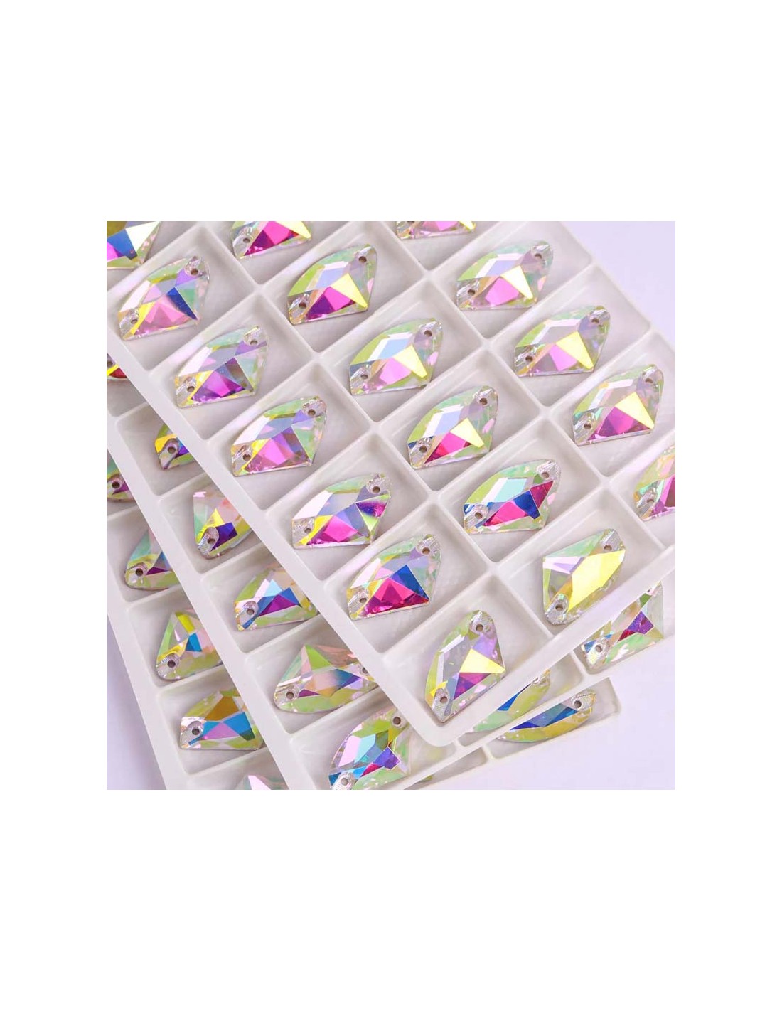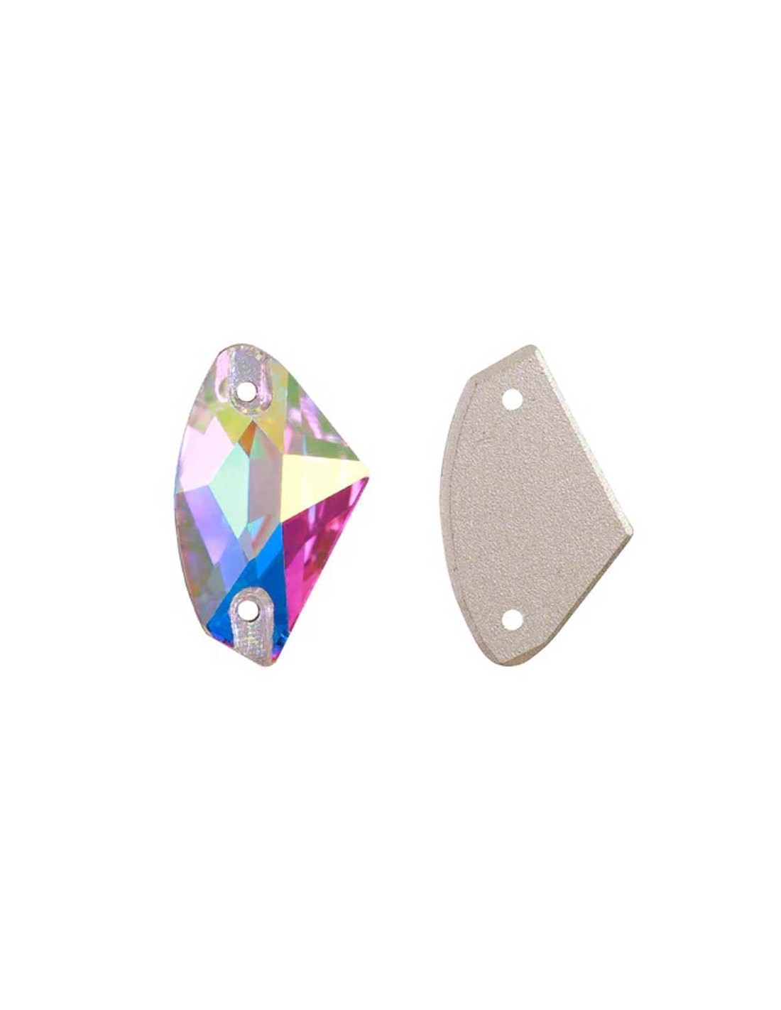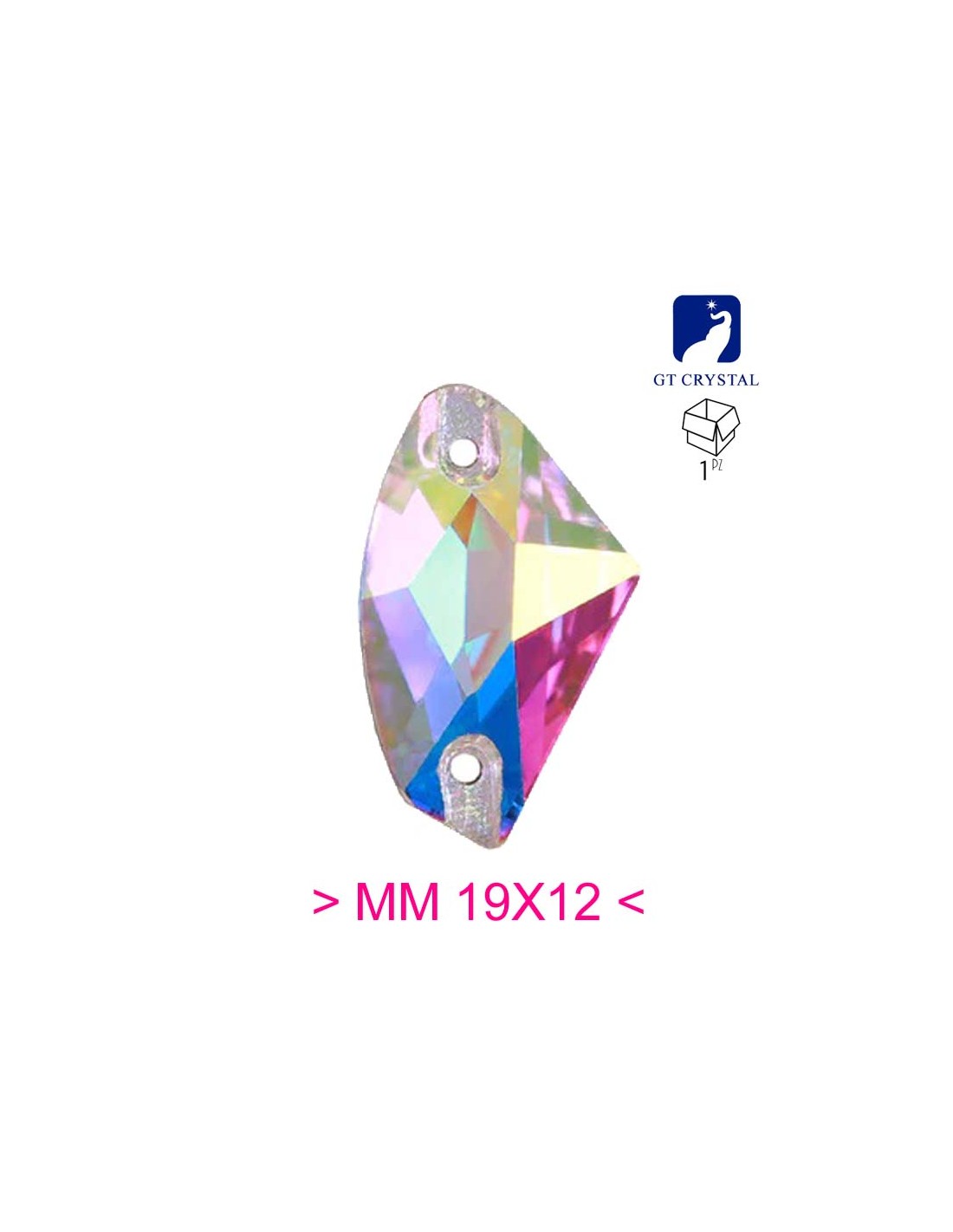 La pietra da Cucire in Cristallo GT Crystal Galactic Crystal Aurora Boreale misura mm 19 in altezza e mm 12 in larghezza, e’ piatta nella parte inferiore ed e’ dotata di due fori nella parte laterale superiore per l’applicazione con ago e filo.