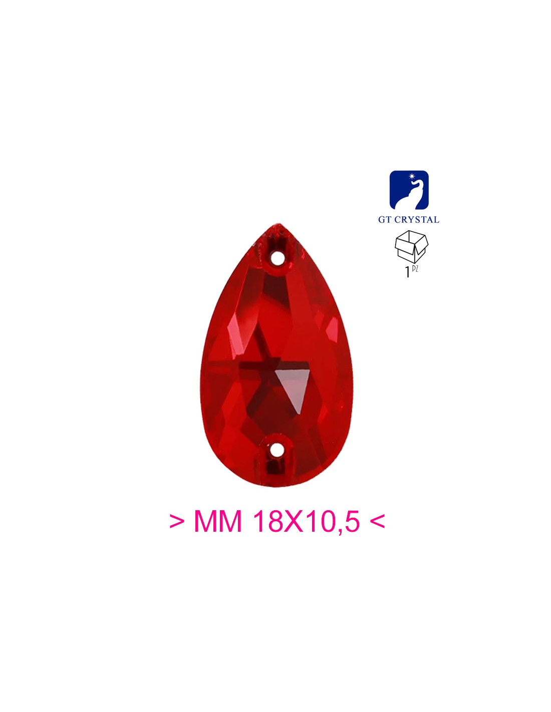 La pietra da Cucire in Cristallo GT Crystal Goccia Light Siam misura mm 18 in altezza e mm 10,5 in larghezza, piatta nella parte inferiore ed dotata di due fori nella parte laterale superiore per l'applicazione con ago e filo.