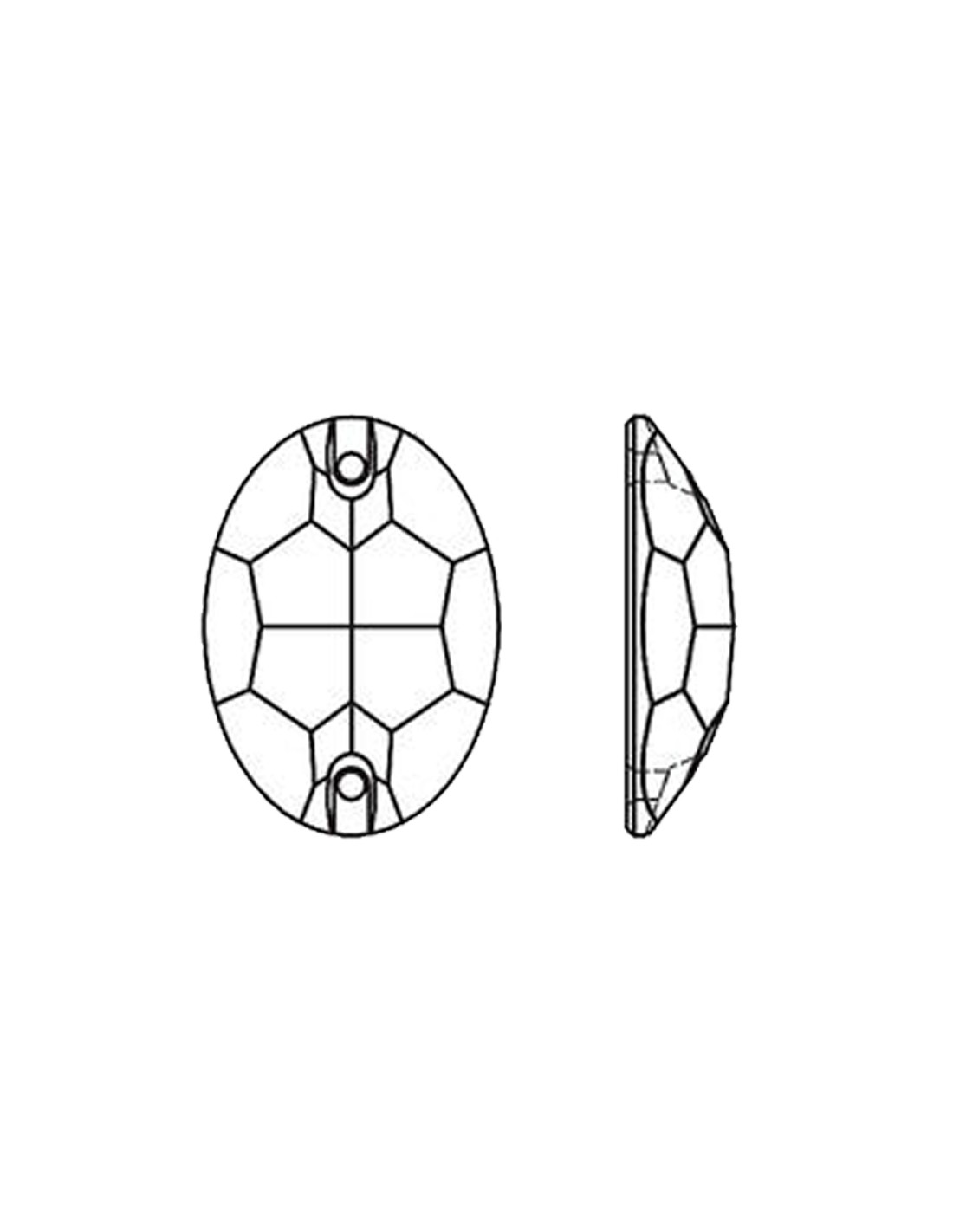 La pietra da Cucire in Cristallo GT Crystal Ovale Emerald misura mm 24 in altezza e mm 17 in larghezza, piatta nella parte inferiore ed dotata di due fori nella parte laterale superiore per l'applicazione con ago e filo.