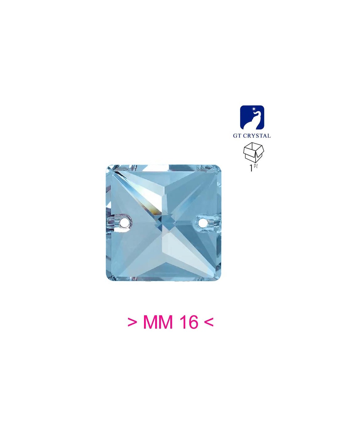 La pietra da Cucire in Cristallo GT Crystal Quadrato Aquamarine misura mm 16 piatta nella parte inferiore ed dotata di due fori nella parte laterale superiore per l'applicazione con ago e filo.