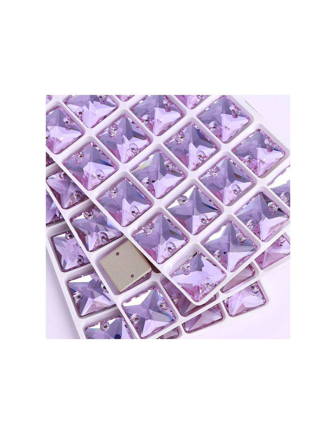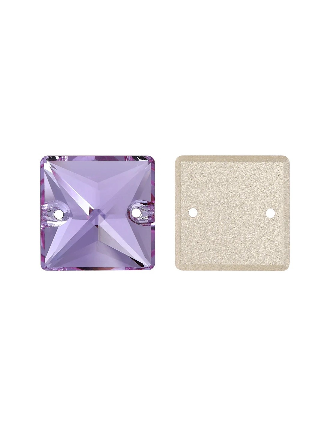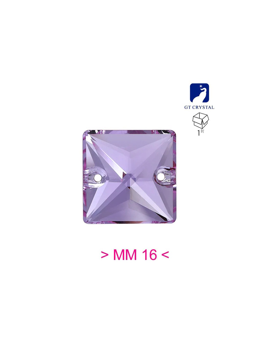 La pietra da Cucire in Cristallo GT Crystal Quadrato Violet misura mm 16 piatta nella parte inferiore ed dotata di due fori nella parte laterale superiore per l'applicazione con ago e filo.