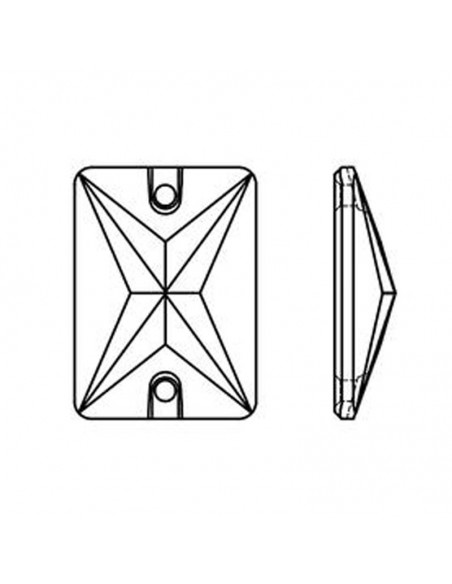 La pietra da Cucire in Cristallo GT Crystal Rettangolo Crystal Aurora Boreale misura mm 25 in altezza e mm 18 in larghezza, piatta nella parte inferiore ed dotata di due fori nella parte laterale superiore per l'applicazione con ago e filo.