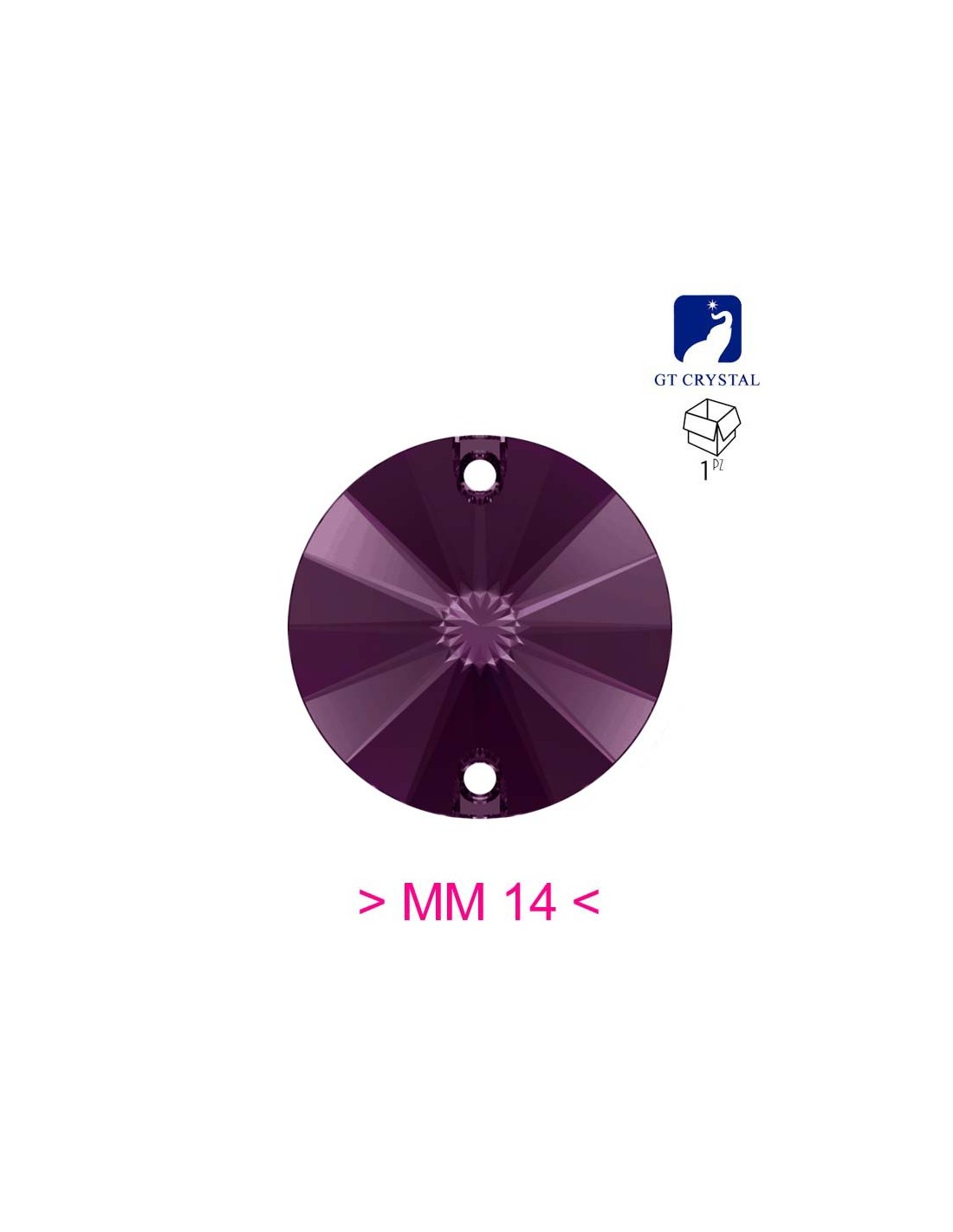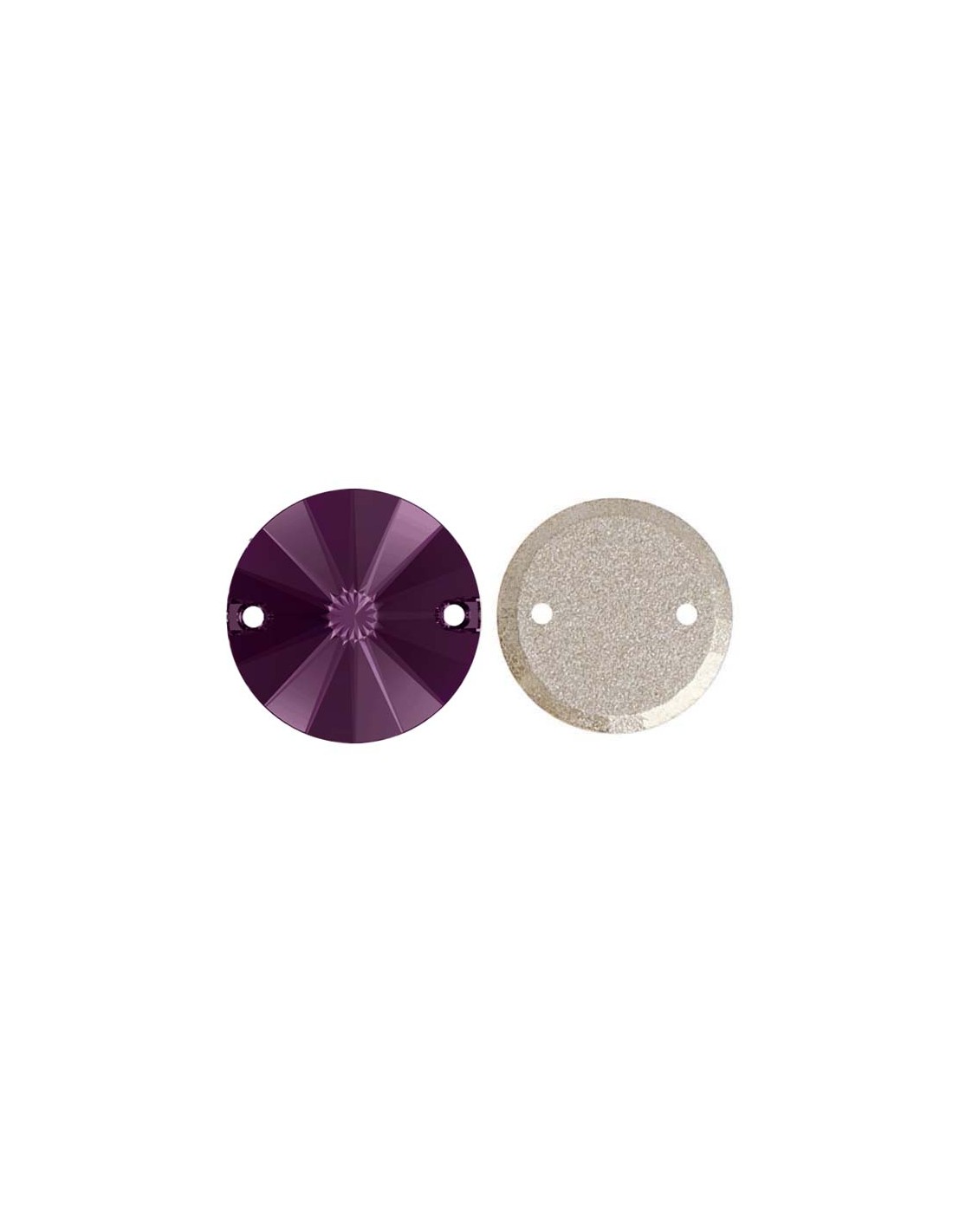 La pietra da Cucire in Cristallo GT Crystal Tondo Amethyst misura mm 14 e’ piatta nella parte inferiore ed e’ dotata di due fori nella parte laterale superiore per l’applicazione con ago e filo.