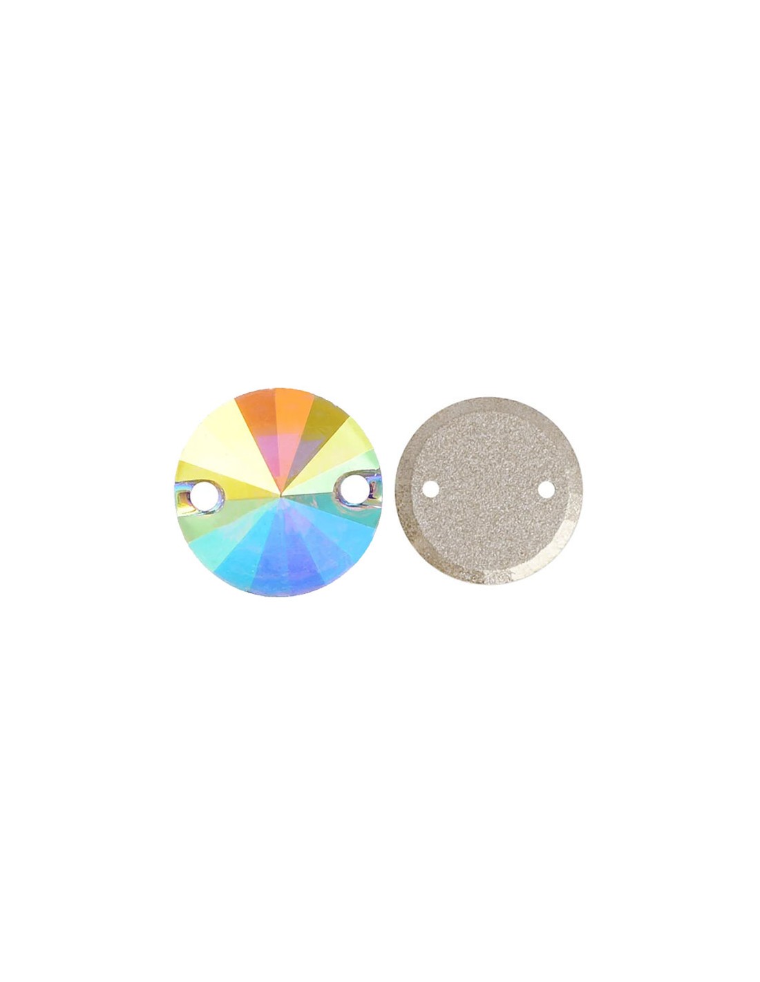 La pietra da Cucire in Cristallo GT Crystal Tondo Crystal Aurora Boreale misura mm 14 piatta nella parte inferiore ed dotata di due fori nella parte laterale superiore per l'applicazione con ago e filo.