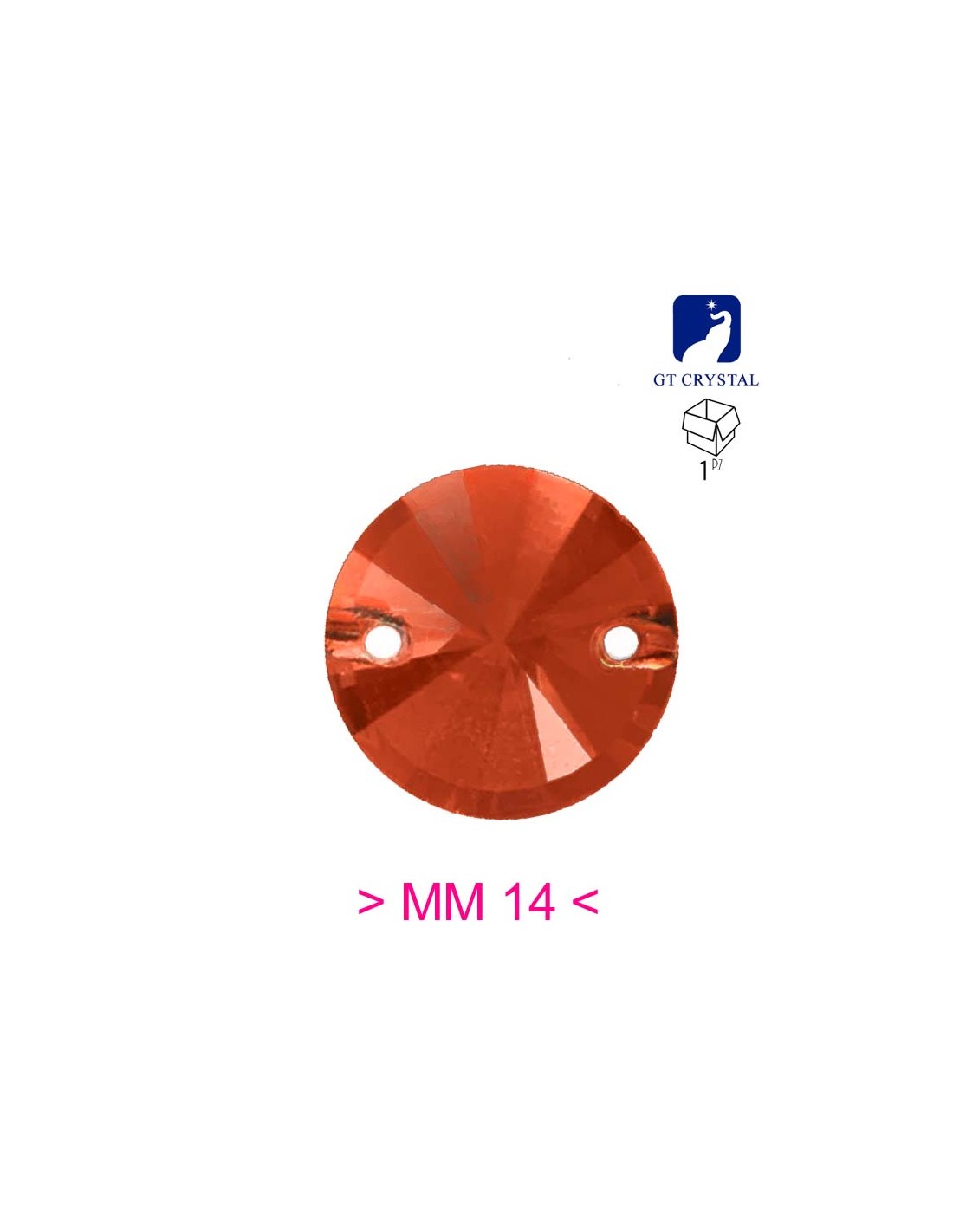 La pietra da Cucire in Cristallo GT Crystal Tondo Sun misura mm 14 e’ piatta nella parte inferiore ed e’ dotata di due fori nella parte laterale superiore per l’applicazione con ago e filo.