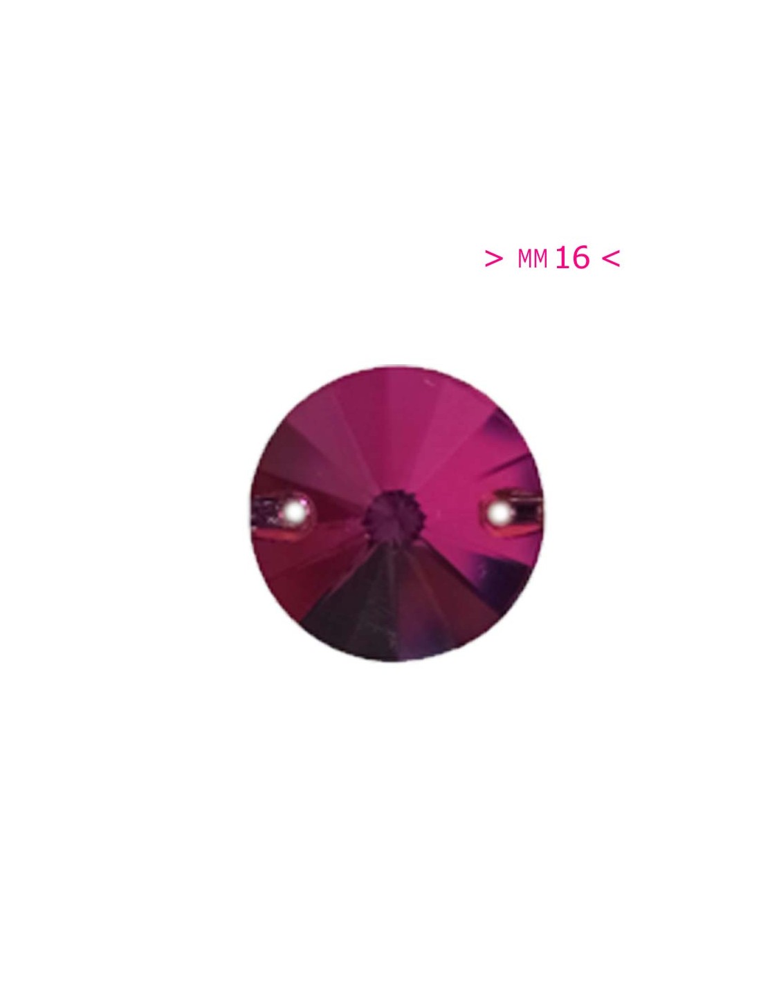 La pietra da Cucire in Cristallo GT Crystal Tondo Fuchsia misura mm 16 e’ piatta nella parte inferiore ed e’ dotata di due fori nella parte laterale superiore per l’applicazione con ago e filo.